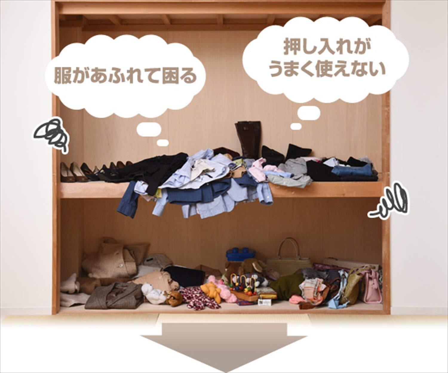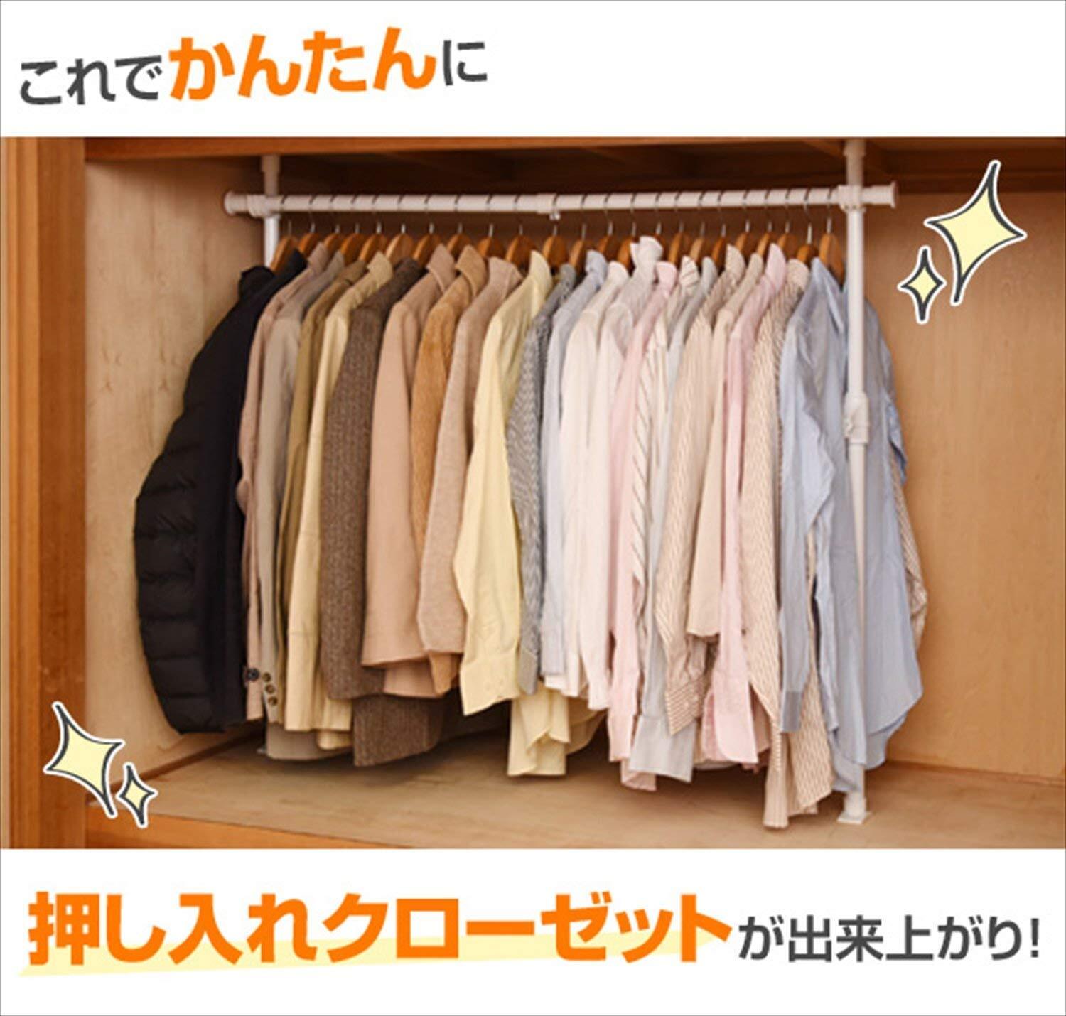 ●ネジ・クギ不要、賃貸でもできる、押入れをクローゼットにかんたんリメイク●ヨコ向き、タテ向き、どちらでも設置できるつっぱり固定式●たてよこ伸縮式、押し入れ内の凸凹にも対応する高さ調整&幅は最大120cmでたっぷり収納●強度も安心、耐荷重30kgで服もしっかり収納●ボタンを押して上げるだけ、オリジナル突っ張り機構で超カンタンに設置可能●組立品(組立時間:約10-20分)