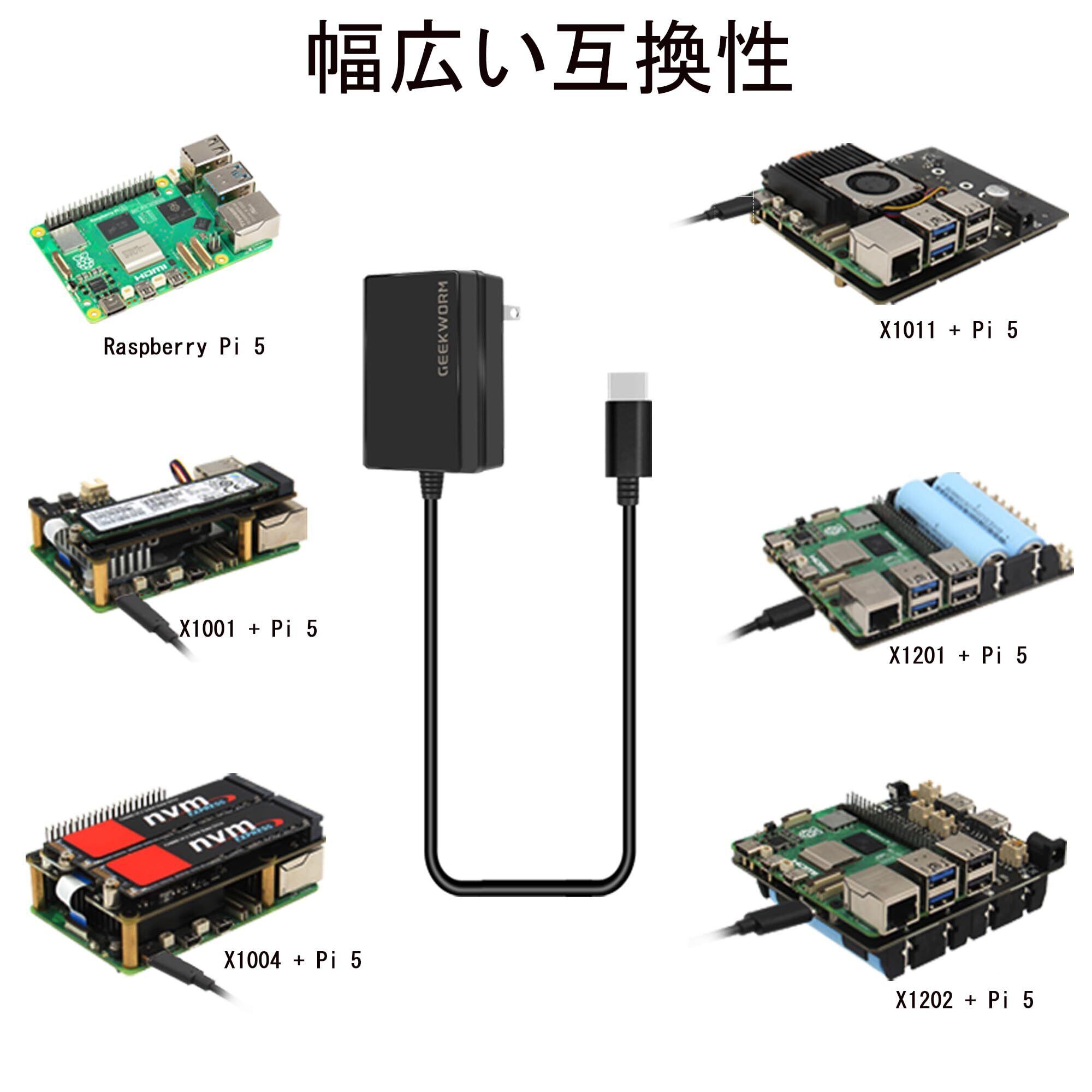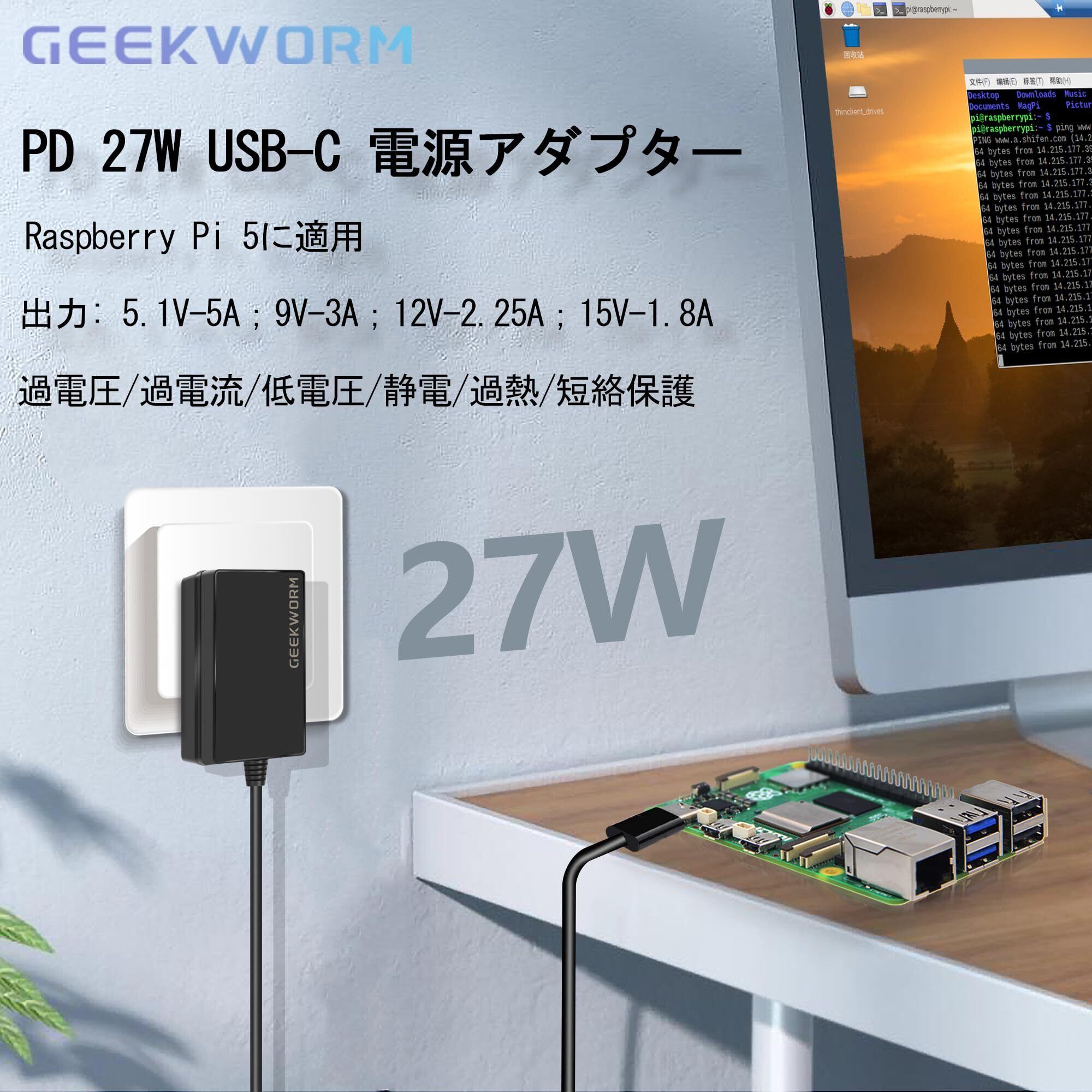 【新春セール】Geekworm USB-C 電源アダプター PD 27W Type C、Raspberry Pi 5 / Pi 4に適用