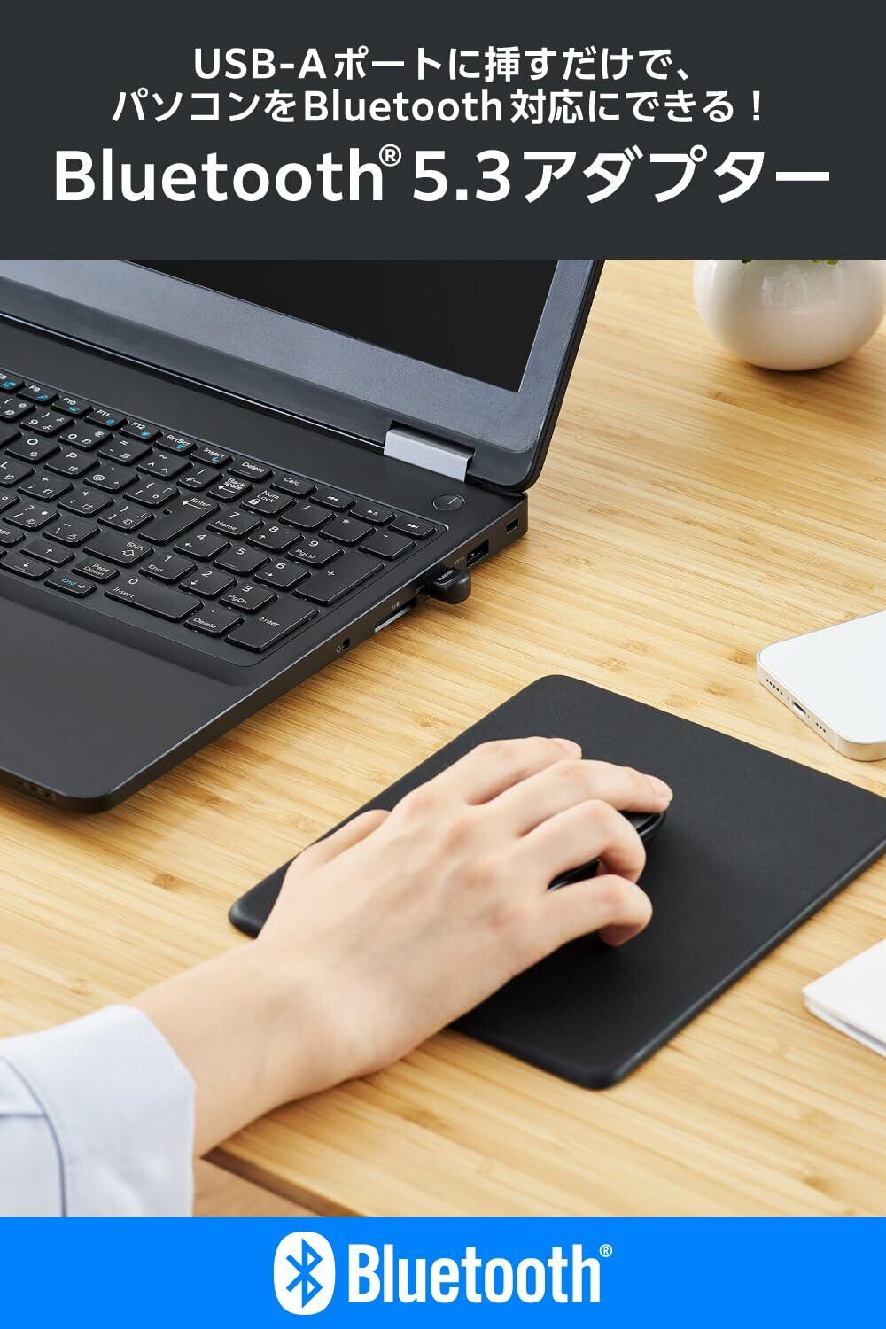 USB-Aポートに挿すだけで、パソコンをBluetooth(R)対応に。Bluetooth Ver.5.3 USBアダプターです。低消費電力で使えるBluetooth Low Energy、通信距離約10mのClass2に対応しています。