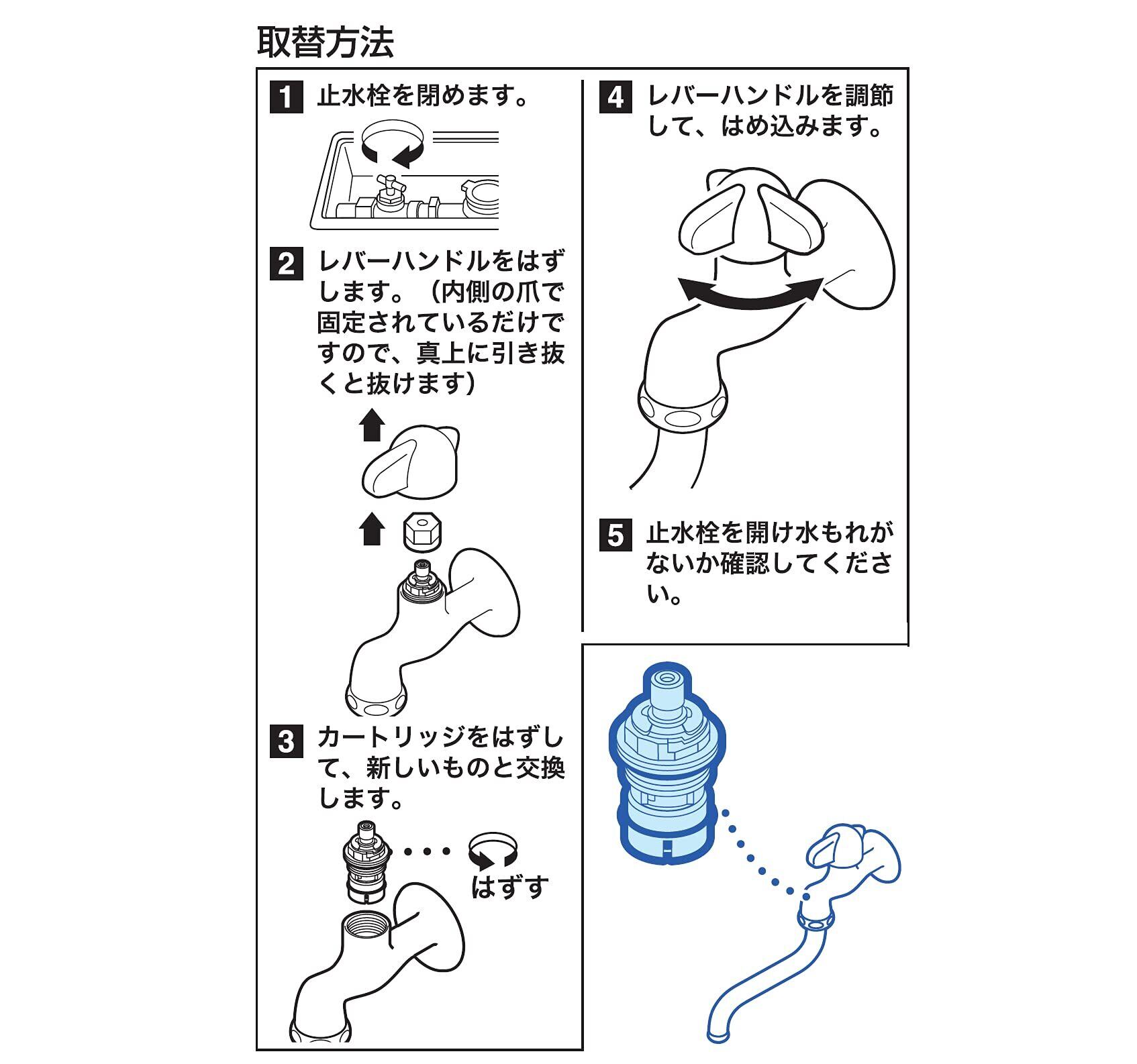 4.新しいカートリッジを取り外しと逆の手順で取り付ける。5.レバーハンドルをはめ込む。6.止水栓を開けて水モレがないか確認する。