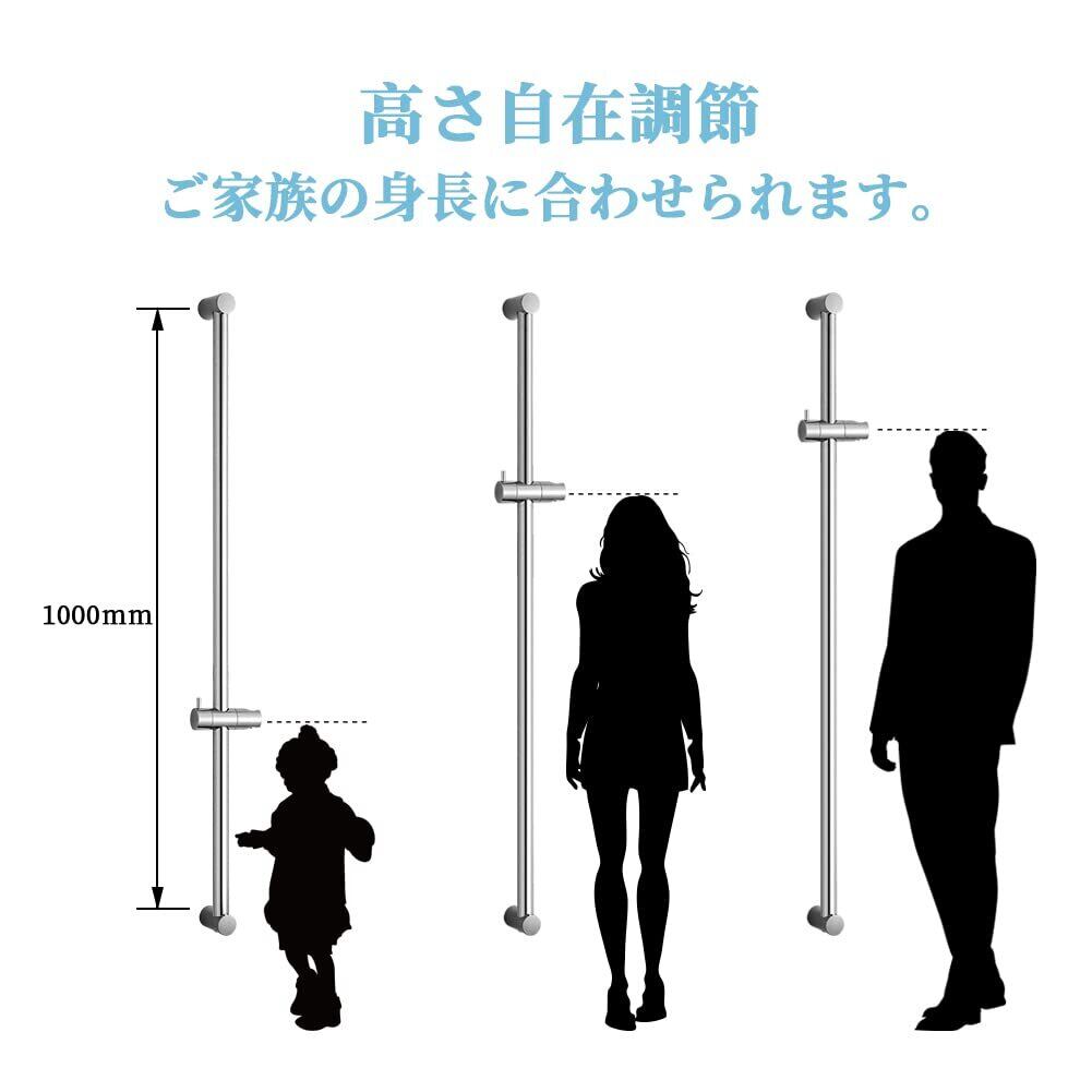 [高さ調節 角度調節] スライドバー使用距離は1000mmで、フックは上下スライドできるし、角度も360度調整できます。ご家族それぞれお好みの高さや角度でシャワーできます。