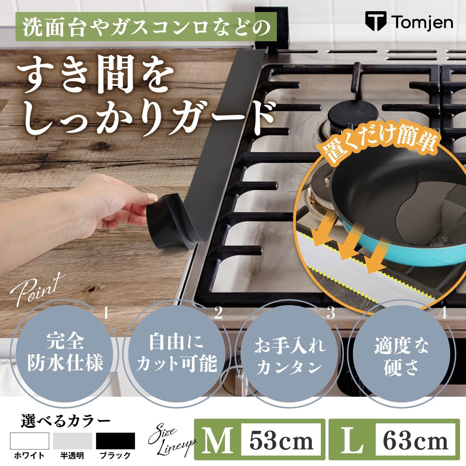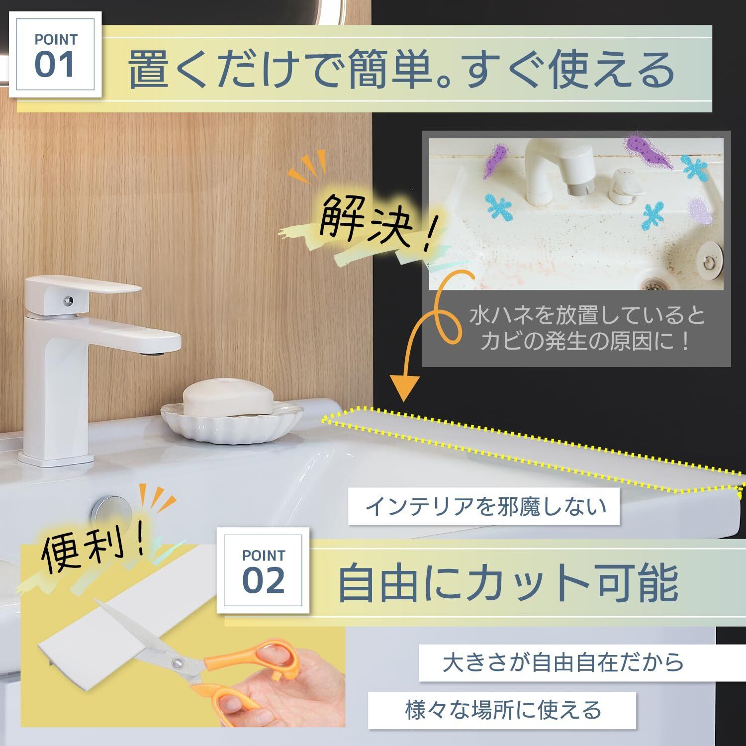 隙間を埋めるだけで水はねを防止: 洗面台やコンロの隙間に置くだけで、水はねや油はねを防止できる便利な製品です。