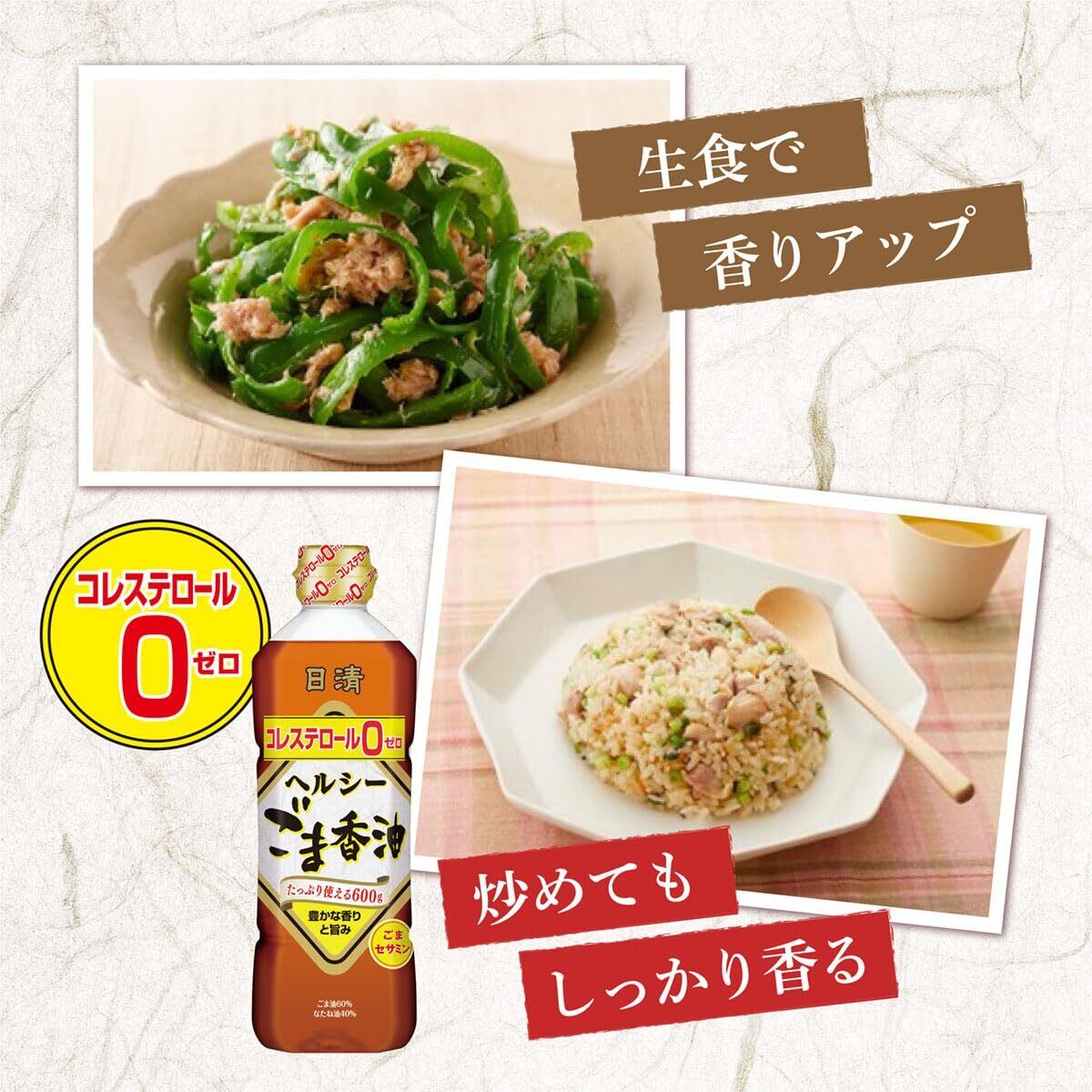 一番搾りごま油と、低温焙煎ごま油と、良質のなたね油をブレンドすることで、「焙煎ごまの豊かな香り立ち」と「ごま本来の旨み」を実現しました。しかもコレステ□一ルO(ゼロ)です。ごまの香りと旨みを楽しみながら、ヘルシーな料理を好む方や、楽しみたい方におすすめの商品です