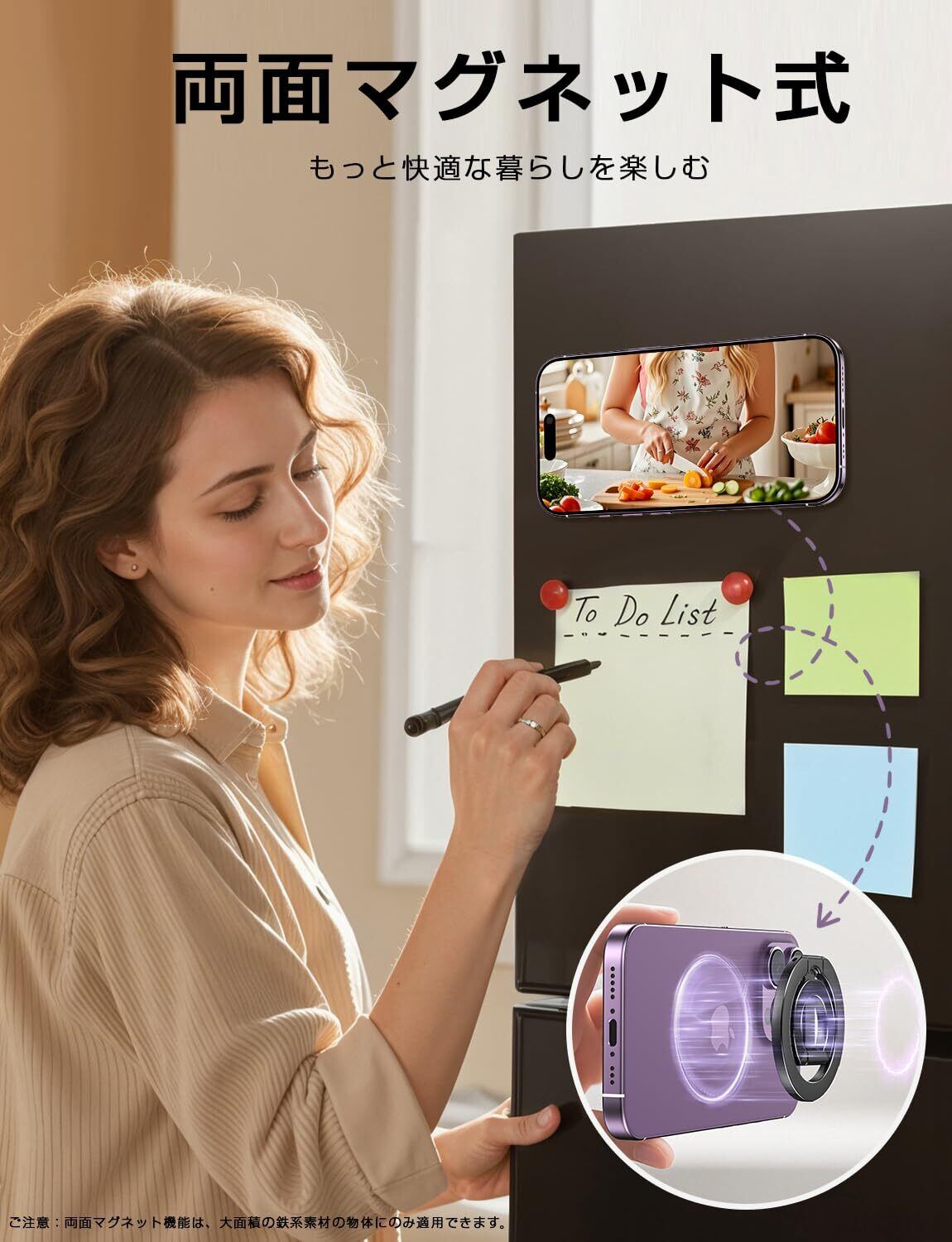 【革新的な両面マグネット機能・ハンズフリーで暮らしを軽やかに】このマグネットスマホスタンドは両面マグネット機能を搭載し、両手を解放した自由を体験できます。本体とリング部分に配置されたマグネットが、スマートフォン側と設置面の双方に同時にピタッと密着します。車載ホルダー・冷蔵庫・洗濯機・ジム設備など、磁力のある表面にはどこでも簡単取り付け可能です!キッチンでのレシピ確認やタイマー表示、ジムでのフォーム動画視聴や運動解説を見ながら運動など、日常の様々なシーンでハンズフリーで利用することができ、スマートで快適な体験を実現します。(※ご使用は大きな面積の金属面、または磁力を有する対象に限ってください。小さい・凹凸のある・磁力の弱い面では保持力が不十分となり、落下の恐れがあります。)