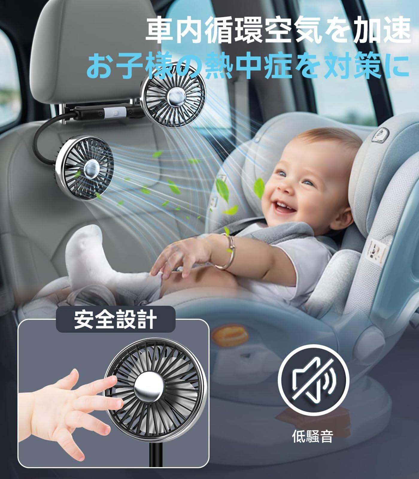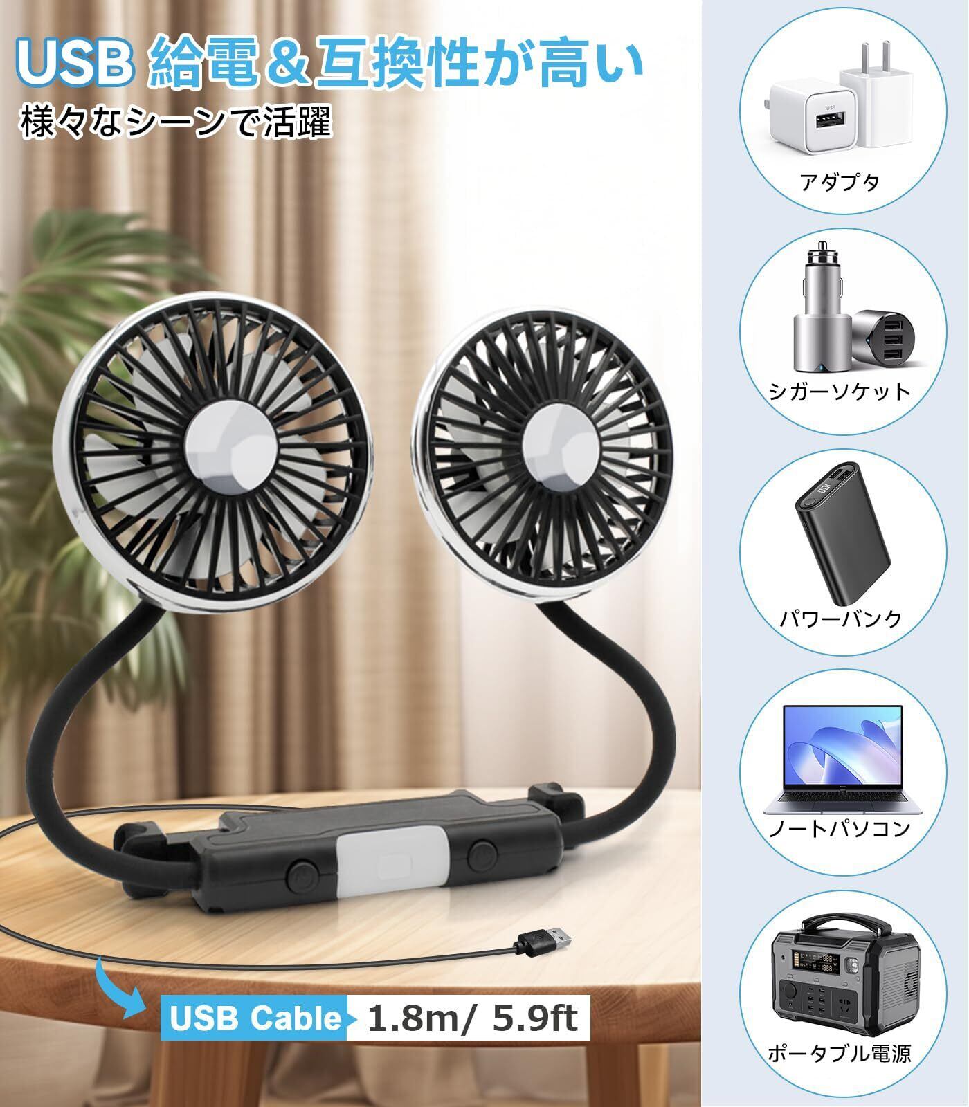 【新着商品】【2025年夏新登場】REBEAUQ 車用扇風機 車載扇風機 5枚羽根 低騒音 双頭車載ファン 360°角度調節可能 3階段風量調節 USB車用 2段階LEDライト 安全設計 取付簡単 省エネ 夏対策 車中泊対策 カー用品 1.8mUSBケーブル付き