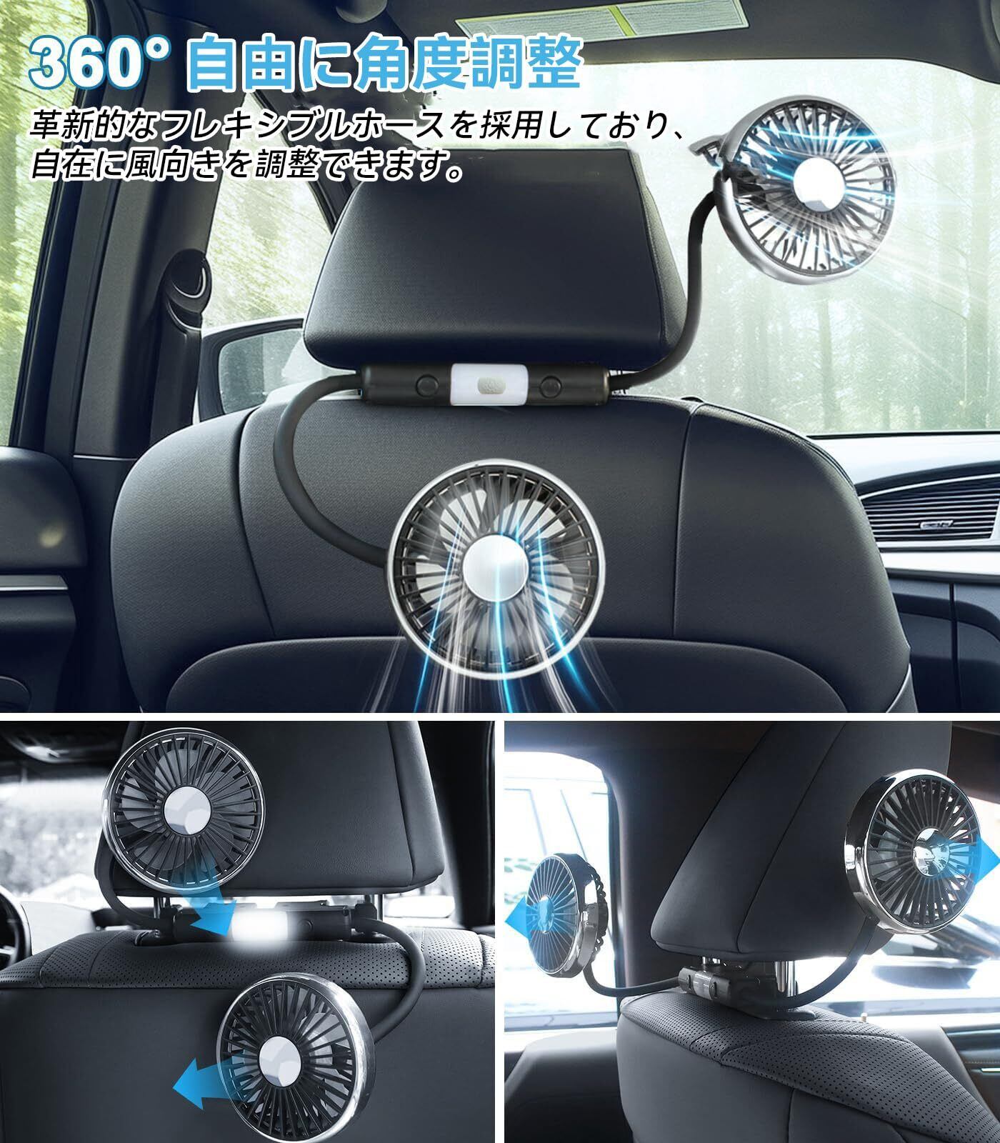 【360°自由角度調整】2024改良版USBカーファンは、革新的なフレキシブルホースを採用しており、お好みに合わせて、柔らかい風から強力な涼風まで、360°自由に角度調整ができます。どの後部座席でも常に涼しく快適な環境を保つことができます。多方向に風を送ることができ、1台で車の後部全体を心地よい涼しさで包むことができます。