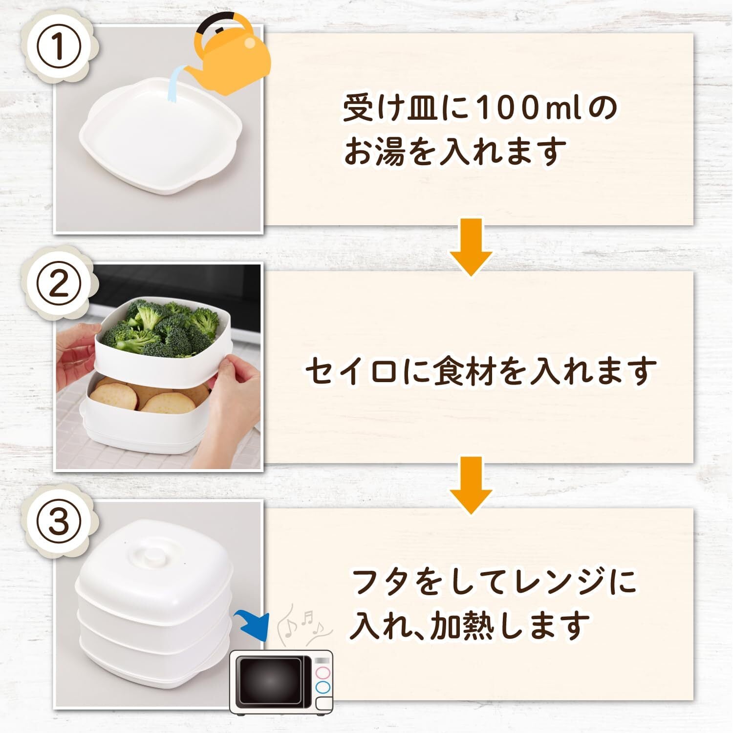 【スチーム加熱でふっくら仕上がる】:受け皿のお湯が蒸気化してムラなく加熱。スチーム加熱でふっくら仕上がる。