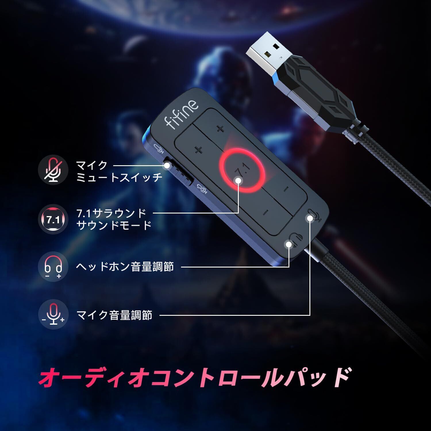 【オーディオコントロールパッドの便利さ】付属のオーディオコントロールパッドは7.1サラウンドサウンドにスイッチ可能で、オンになると赤色LEDが光っていてわかりやすくなります。ヘッドホンとマイクの音量も制御でき、それぞれの音量ボタンでいつでもコントロールできます。さらにマイクのミュートボタンも付き、いざという時にスライドでスイッチできます。