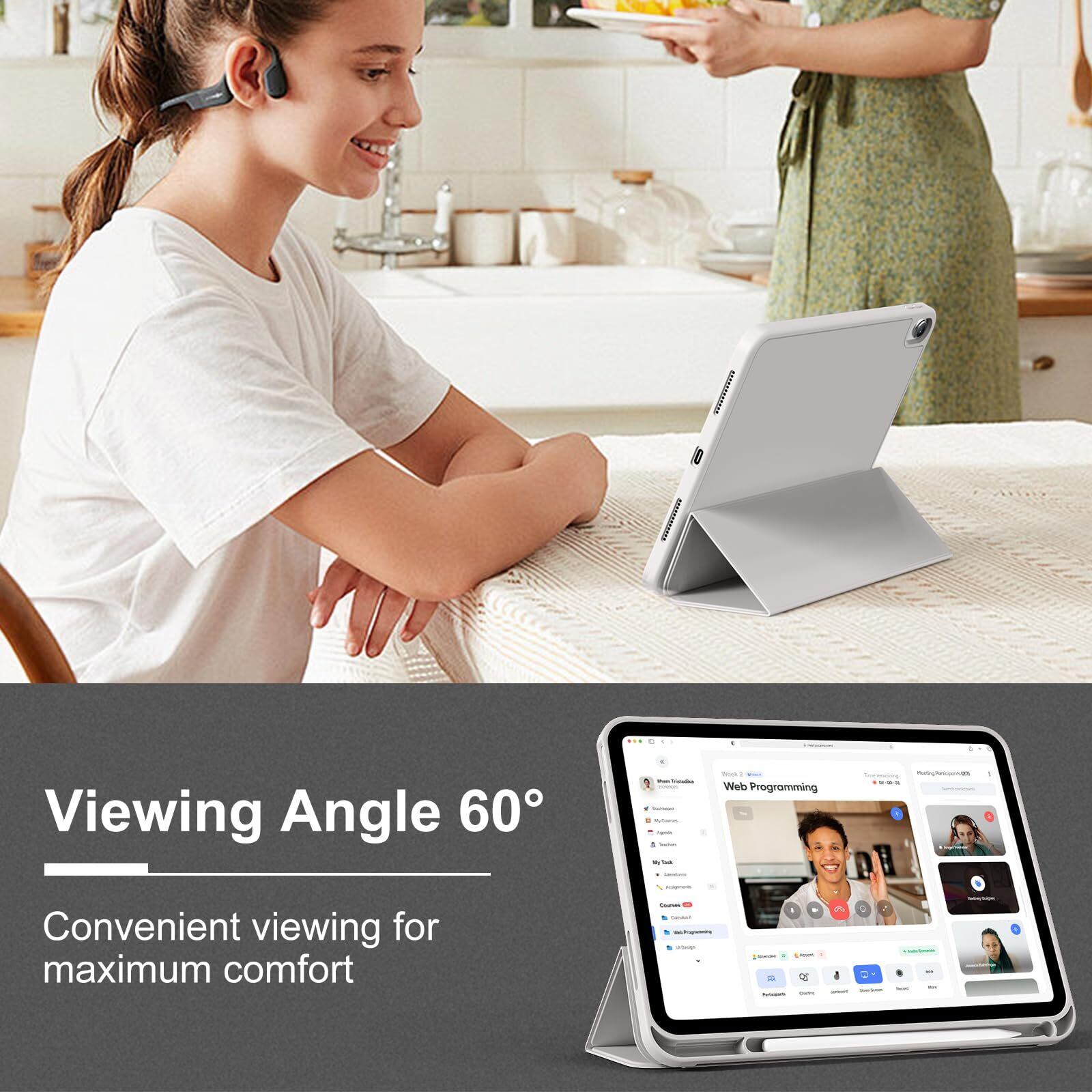 【三つ折りスタンド】強力なマグネット式三つ折りスタンドで、iPadを安定して立てられます。65°のビューイングモードと30°のタイピングモードで快適にiPadを使用できます。