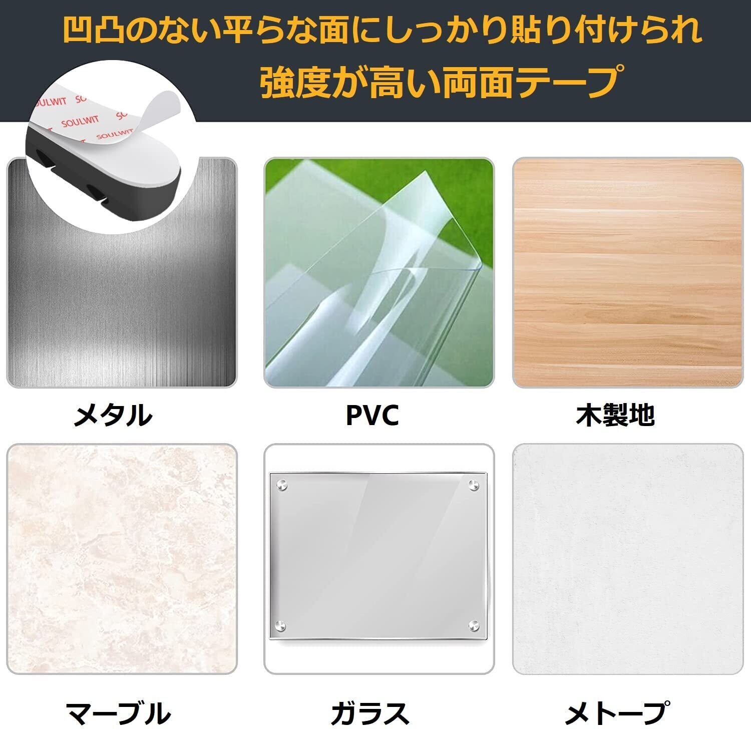 【強力な両面テープ】強度が高い両面テーブルを使用してホルダーを凹凸のない平らな面にしっかり貼り付けられます。例えば木製や金属製、ガラス製や大理石などの材質の表面に利用できます。そしてデスクや床のような場所にケーブルを留めておけるほか、壁や家具の側面、車内などにケーブルをすっきり配線できます。