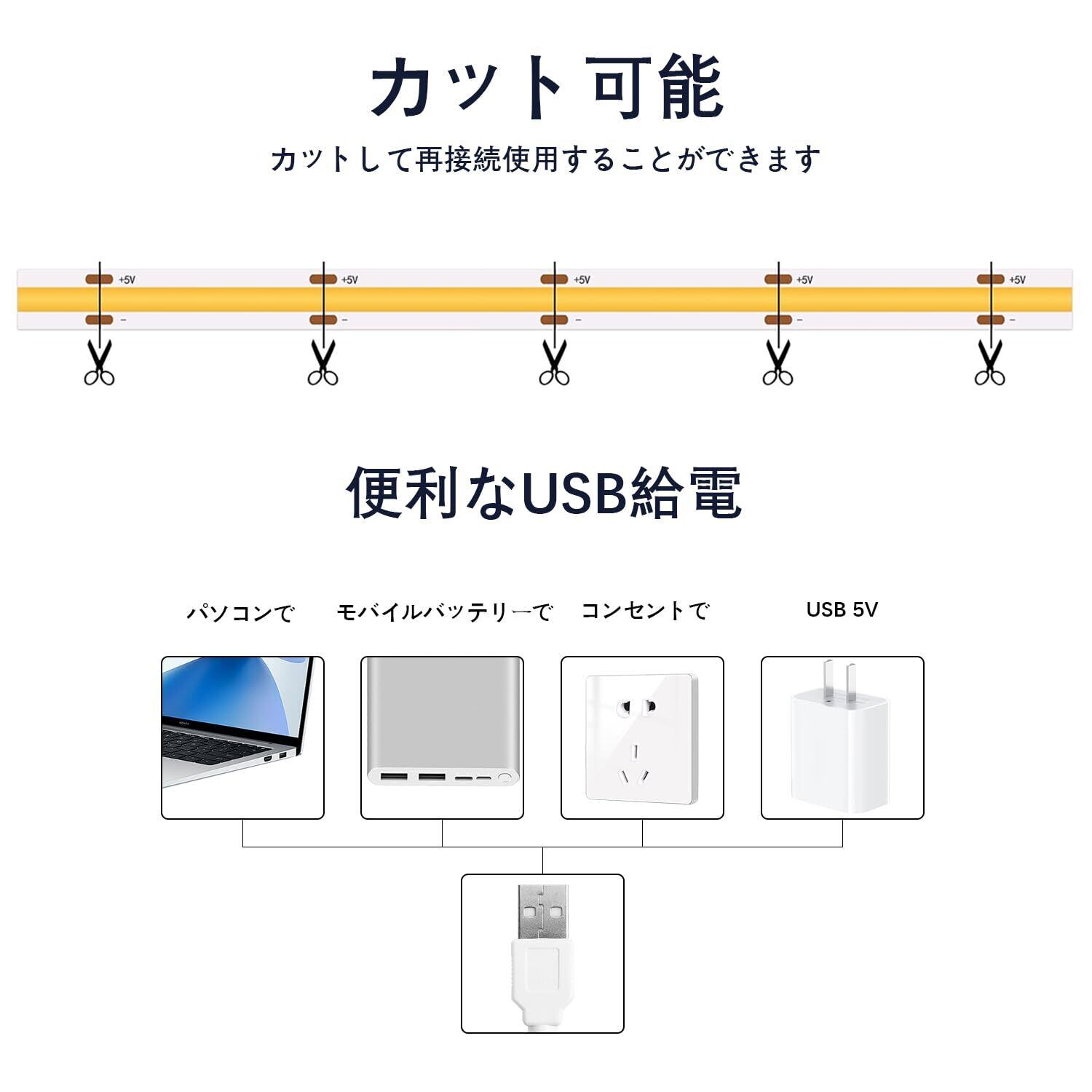 ledテープライト COB 高密度 usb給電 2m 3000K CRI>93 テープ照明 10段階調光 320LEDs/m カット可能 両面テープ設置 高輝度 テープライト cob 電球色
