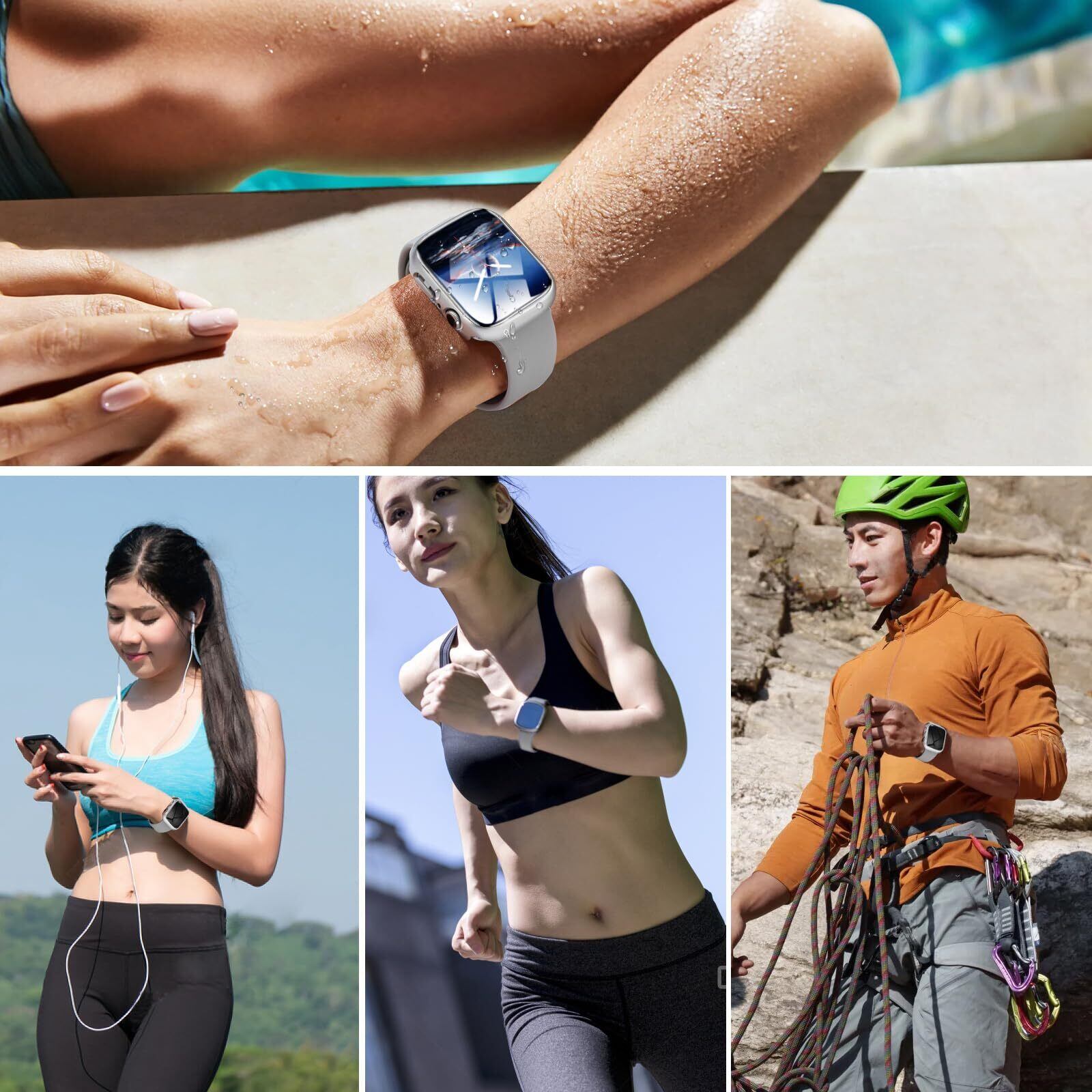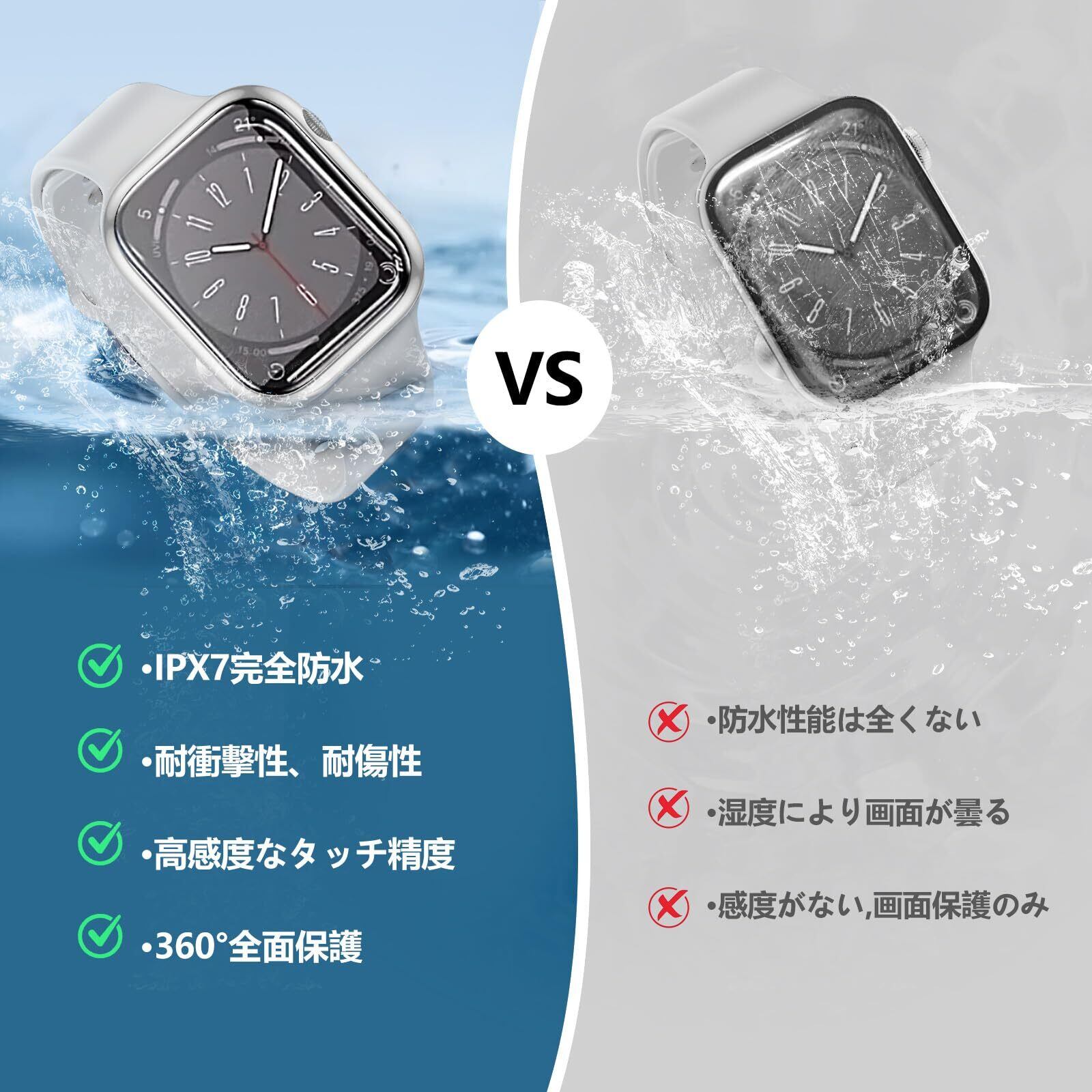 【防水・防塵】シーリングリング内蔵したApple Watchケース、Apple Watchの画面にぴったりとフィットし、水の浸入を防ぎます。ほこりを完全に防ぎ、ケースを取り外して水を拭くすることを繰り返す必要はありません。疎水性撥油性抜群の強化ガラス表面により、カバー面に水が溜まらず、シャワー、手洗い、発汗、運動、雨など、日常の使用に適しています。(ご注意:ダイビングなどの深層水耐性には適しません。)