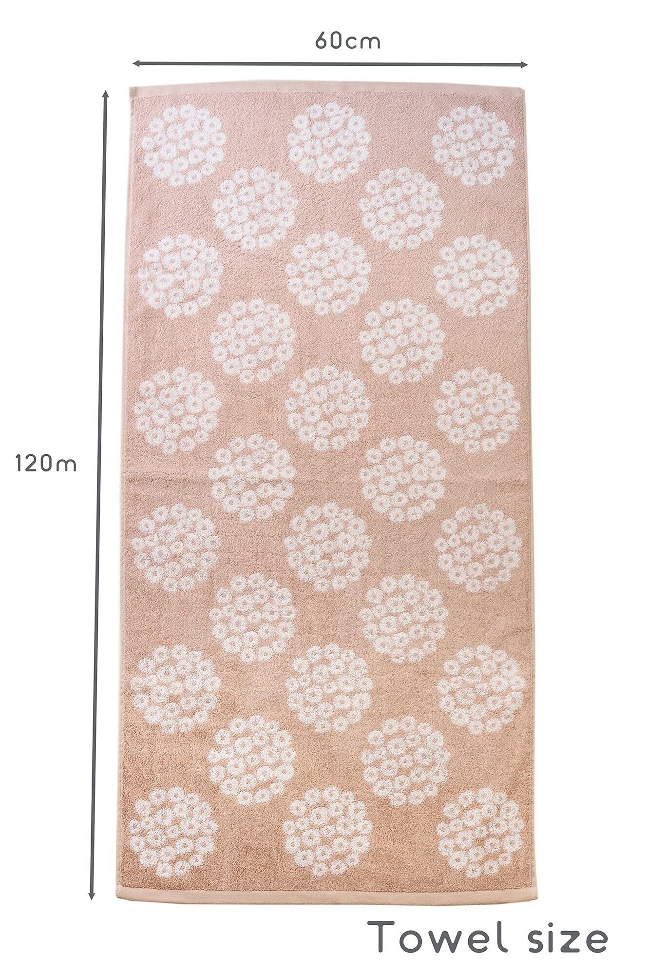 「花束」をモチーフにつくられたデザイン。少しくすんだ色合いが優しいイメージとぴったりです。普通の糸より、撚りが甘いあま撚り糸を使った、ふんわりと肌触りのやさしいタオルです。