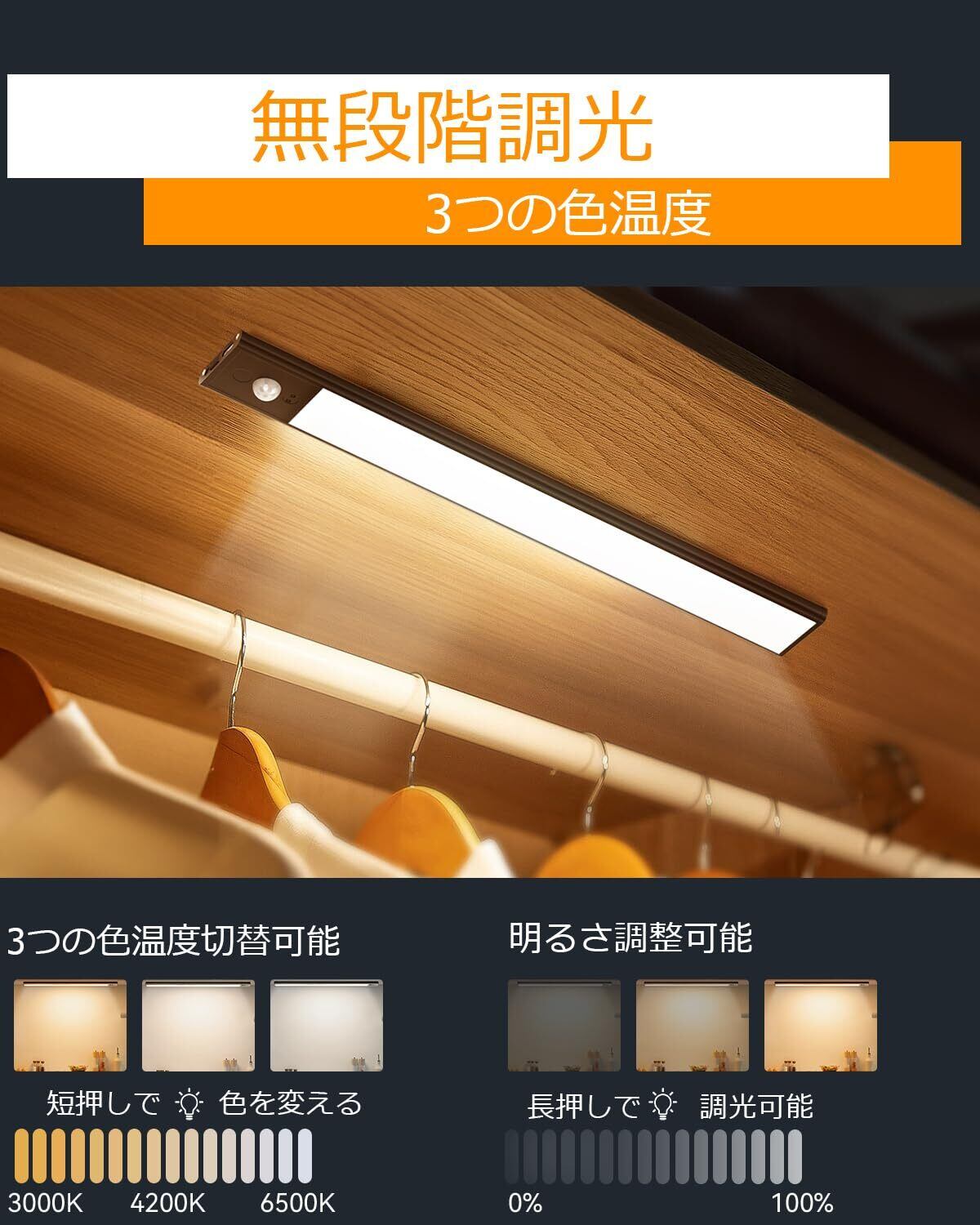 【連続点灯60時間】 人感センサーライト 充電式 室内 マグネット LEDバーライト 読書灯 棚下 Type-C 充電式 無段階調光 キッチン用 屋内 寝室 廊下 階段 玄関 階段 3000K/4500K/6000K 電球色 昼白色 昼光色調整 2200mAh 40cmブラック 2本