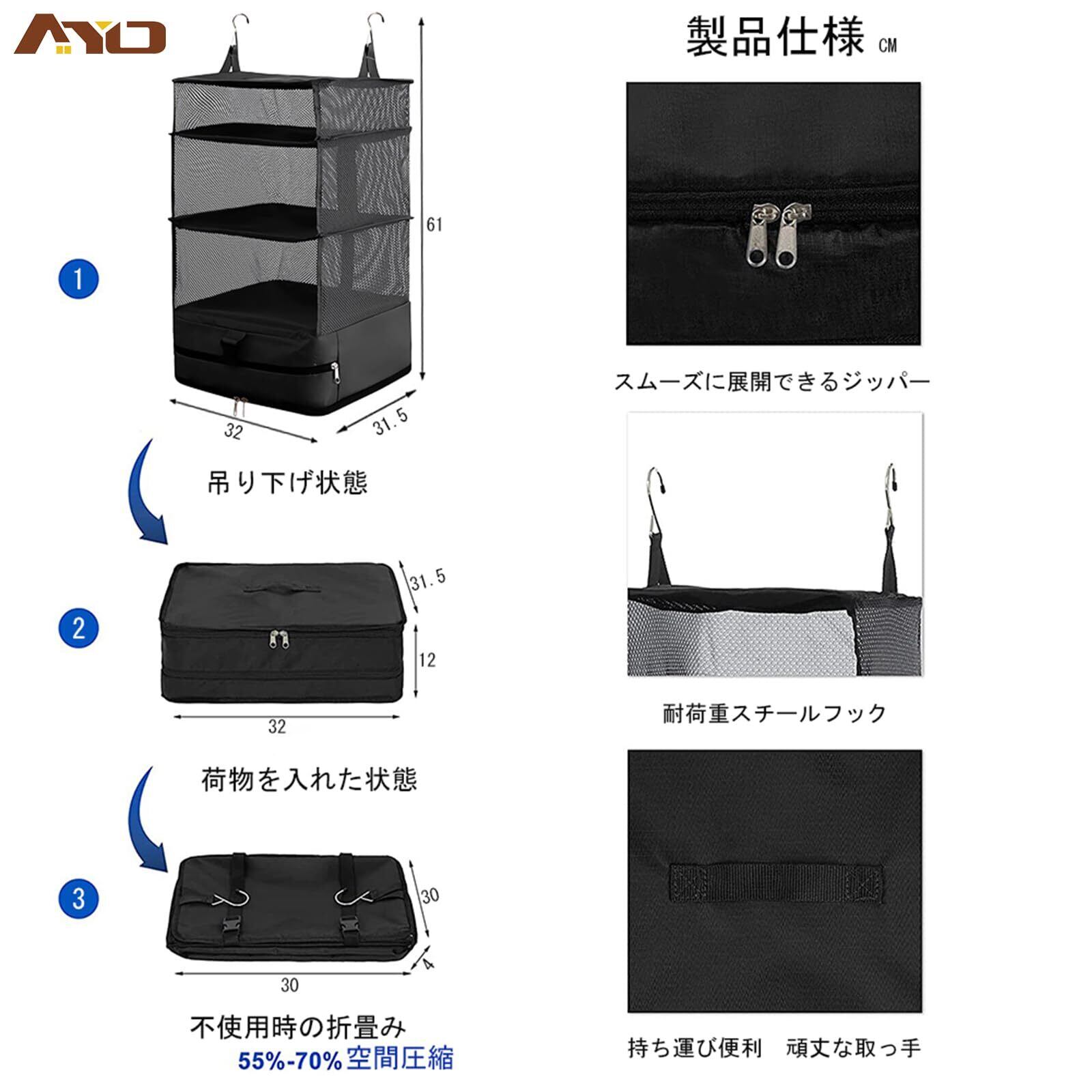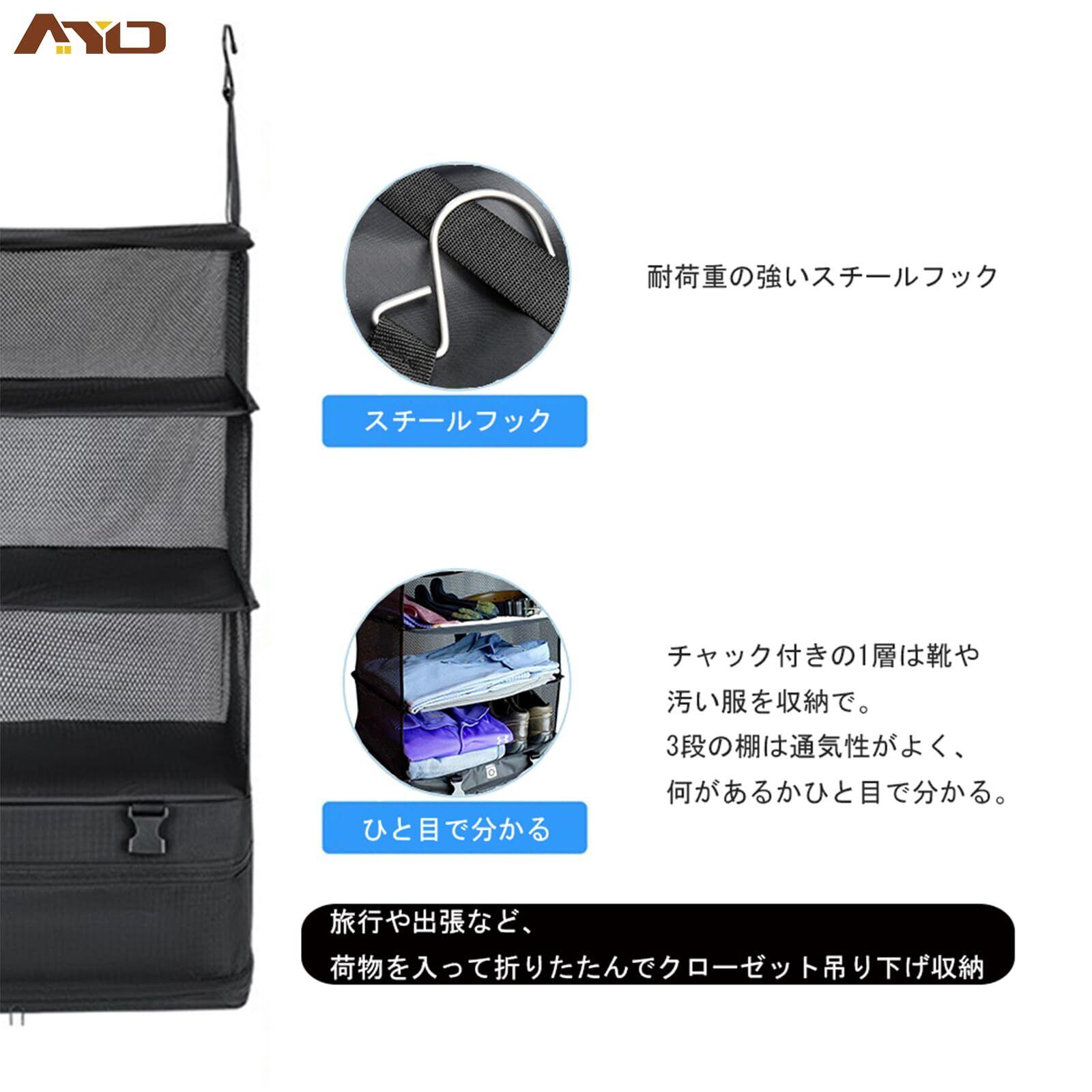 AYO クローゼット吊り下げ収納 インナーバッグ 収納ボックス 衣類ラック クローゼット 吊り下げ収納 衣類収納ラック 衣装ケース 収納 旅行 出張 吊り下げ衣類ラック 省スペース 大容量 4段 取付簡単 折り畳み式 ブラック L