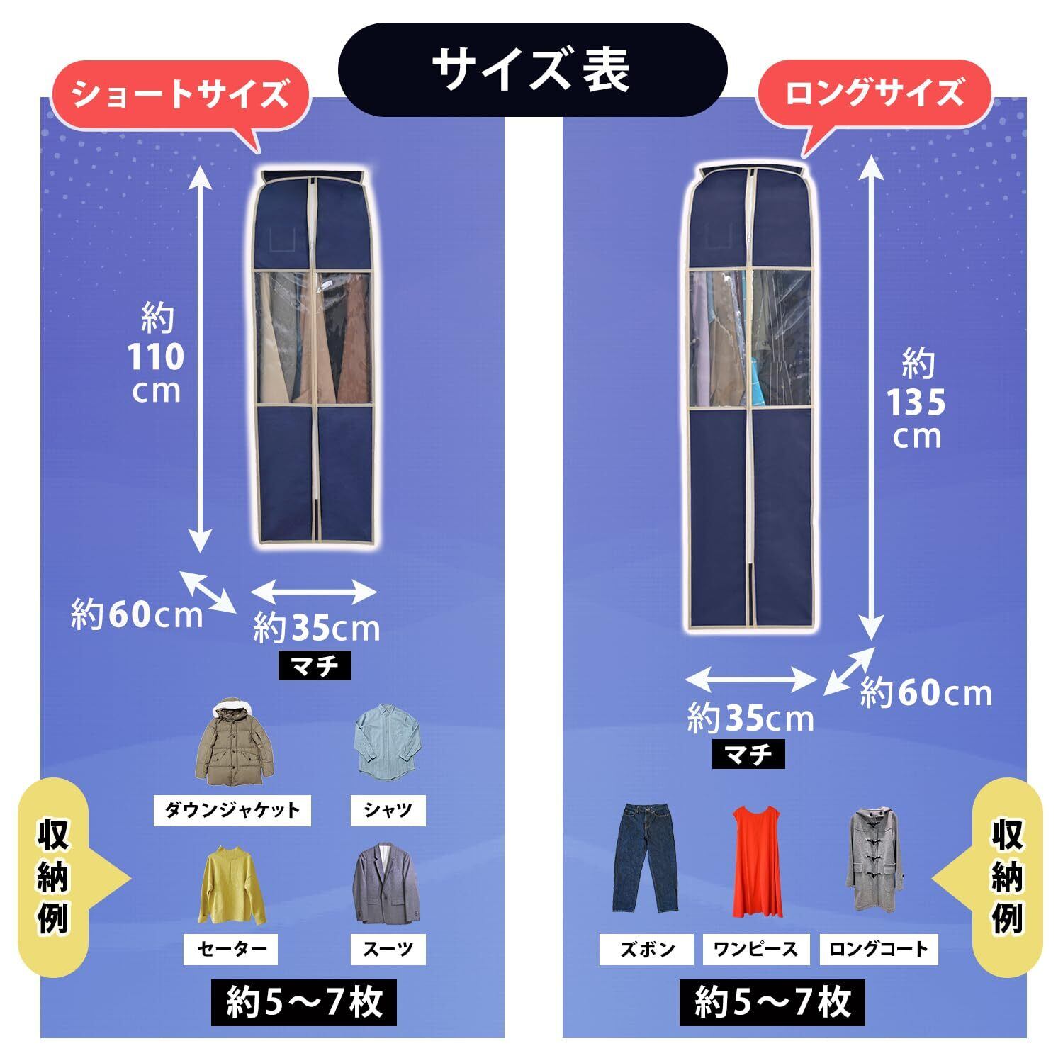 サイズ:スーツ用/約奥行60×幅35×高さ110㎝、ロング用/約奥行60×幅35×高さ135㎝