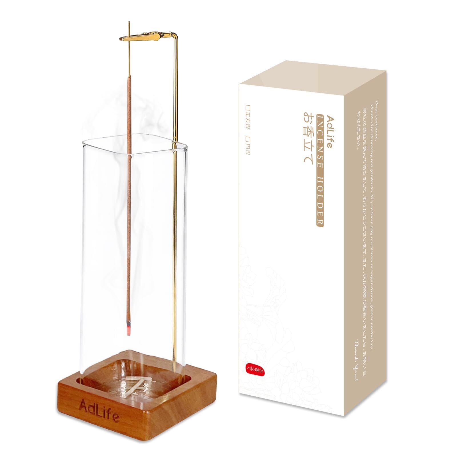 【数量限定】AdLife お香立て 灰がこぼれない 吊り下げ式 線香立て 香炉 ガラス 真鍮 木製台座 おしゃれ 可愛い インテリア 香道 仏壇 寝室 書斎 玄関 ヨガ 瞑想 贈り物に (方形)
