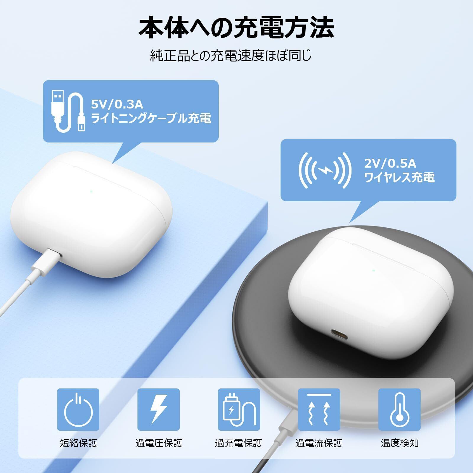 【QI標準のワイヤレス&ケーブル充電】この充電ケースは、ポータブルバッテリーが内蔵され、純正品より容量が大きい充電器です。充電ケースはLightningケーブル充電・無線充電両方に対応しています。最高のセキュリティを備えており、AirPods 第3世代のワイヤレス充電をより安全にします。 短絡、過電圧、過電流、過充電からの保護もついています。