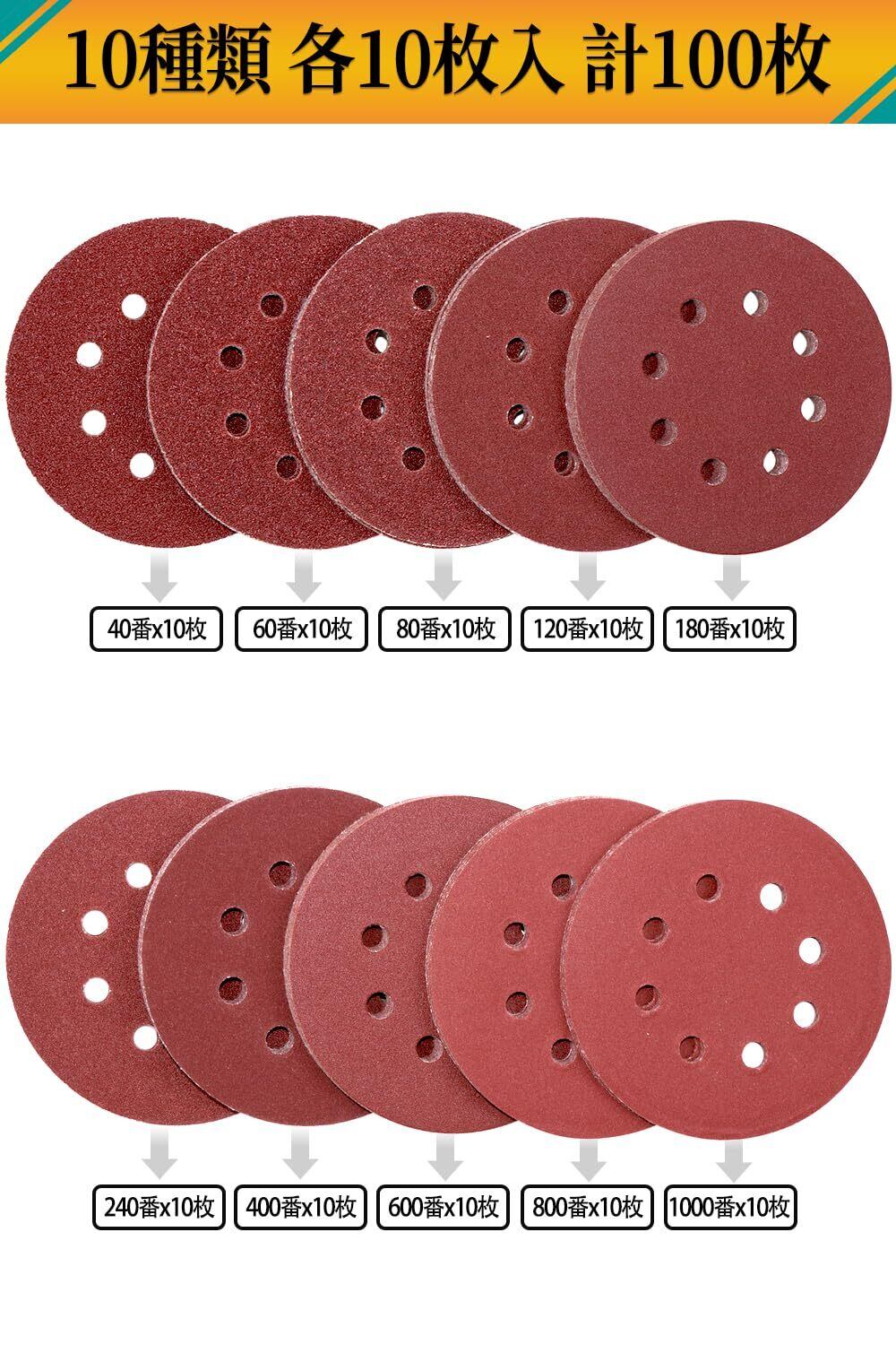 ディスクペーパー 125mm ランダムサンダー ペーパー 8穴 丸型 サンディングディスク マジック式(#40#60#80#120#180#240#400#600#800#1000 ×各10枚),電動サンダー用サンドペーパー(100枚入)