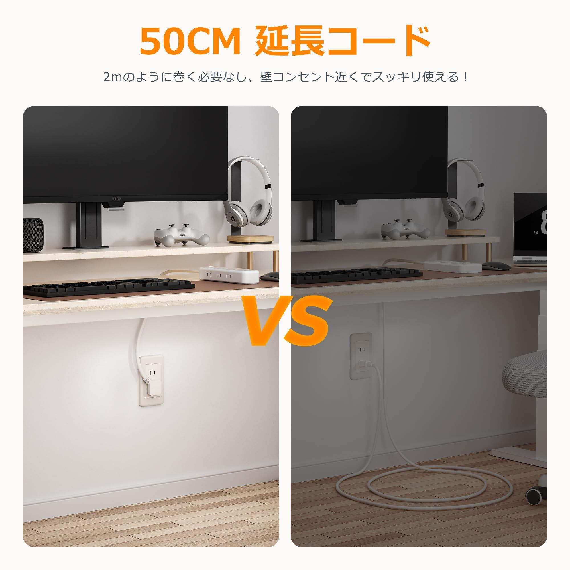 【 延長コード 0.5m 短い】0.5メートルの長さを活かし、デスク周りやキッチン、ベッドサイドなど、コンパクトなスペースでの使用に最適です。サイズはわずか7.8x5.2x3.7cm、154gの小型で軽量なusb付き電源タップです。場所を取らないコンパクトなデザインなので、持ち運びも楽です。旅行や出張に最適です。