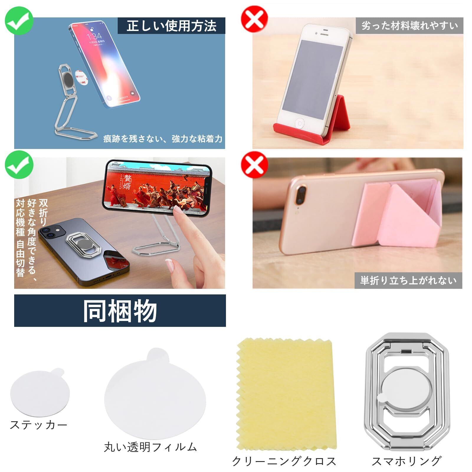 スマホリング 携帯リング リング ホルダー 折りたたみ式 スタンド機能 360°回転 薄型 滑り止め コンパクト耐久性 貼り替え可能 落下防止 粘着テープ式しっかり固定式 バンカーリング 携帯電話 iPhone/Android/switch/kindle/ipadタブレット など各種機器対応(シルバー)
