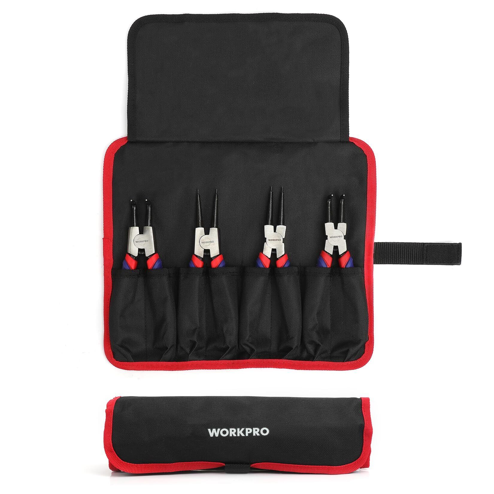 WORKPRO スナップリングプライヤー 4本組 穴用 軸用 直爪 曲爪 先端直径φ2.0mm Cr-V材質 錆びにくい C型リングの着脱 バネ付き 工具 作業 修理 全長180mm 収納袋付き
