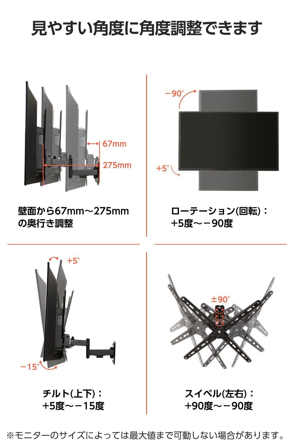見やすい角度でテレビを楽しめる!上下・左右・回転など、お好みの角度に調節できるテレビ壁掛け金具です。13インチ~55インチのフラットパネルテレビに対応するシングルアーム フルモーションタイプ。テレビ台が不要になるため、テレビ下のスペースを有効活用してお部屋を広く使うことができます。