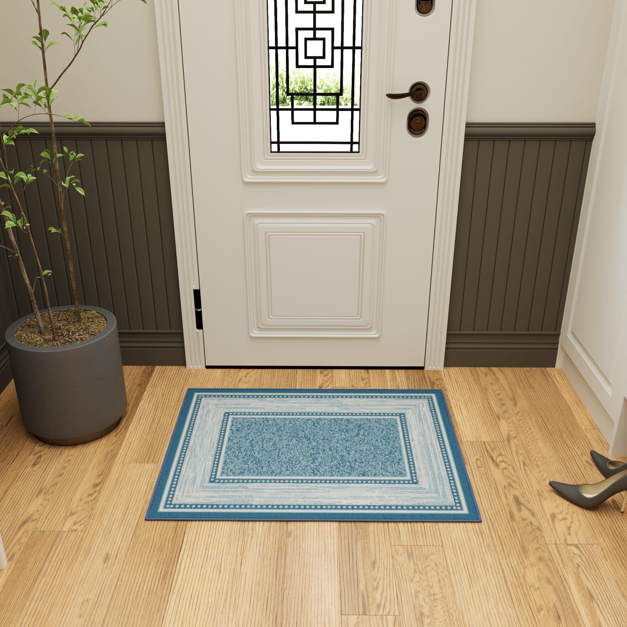 【人気商品】オットマンソン(Ottomanson) エリアラグ コンテンポラリーボーダーデザイン ブルー 裏面ゴム 69×91cm 【日本正規輸入品】