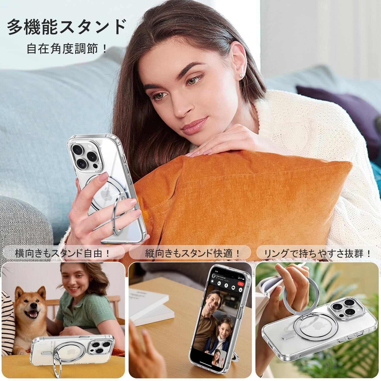 【新春セール】iPhone 15 Pro 適用 ケース Magsafe対応 アイフォン15プロ カバー 360°回転スタンド Uovon スマホケース アイホン 15pro 携帯ケース ワイヤレス充電 車載ホルダー 対応 ストラップ穴付き 透明 指紋防止 黄变防止 ・ クリア