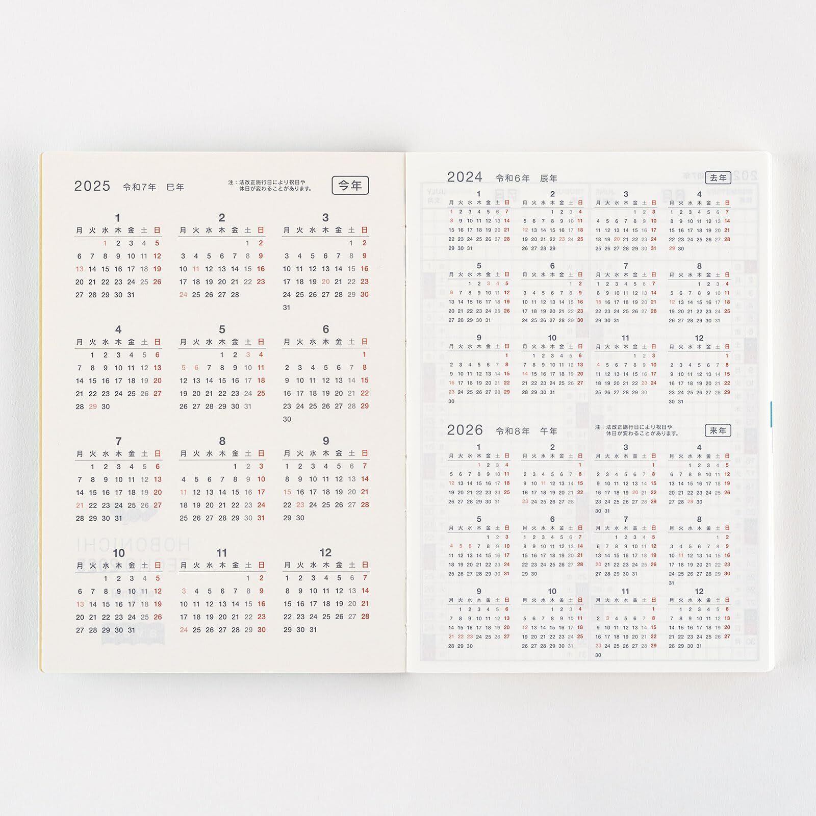 *右ページに「ミニカレンダー」を掲載(月曜はじまり)。