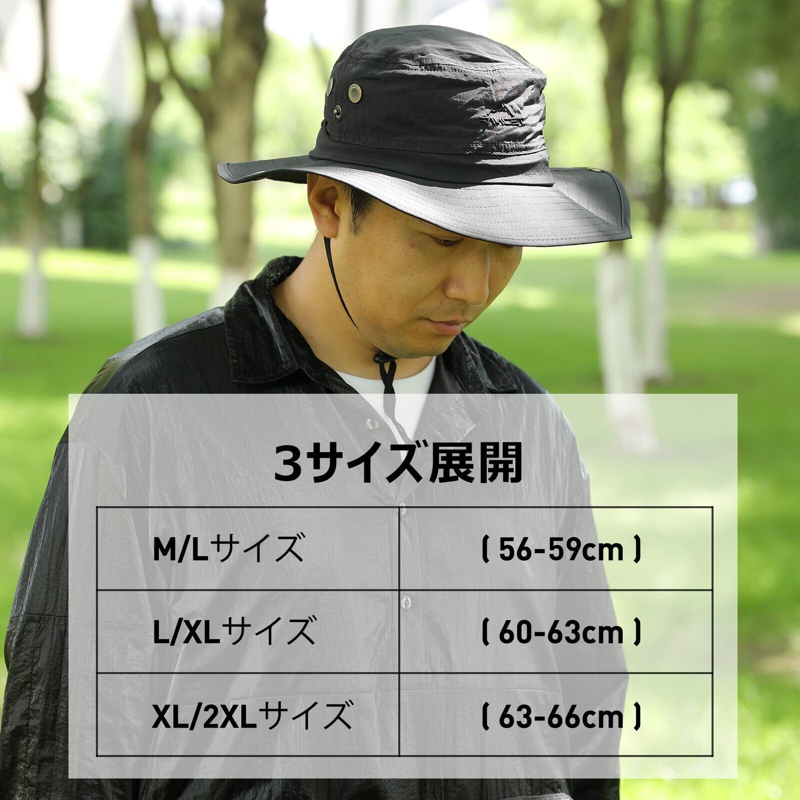 【サイズ&カラー】3サイズ展開:M/Lサイズ 適応頭周り:56-59cm・L/XLサイズ適応頭周り:60-63cm・XL/2XLサイズ適応頭周り:63-66cm、ツバの長さ 8cm ;4色展開:アーミーグリーン、ライトグレー、ダークグレー、ブラック