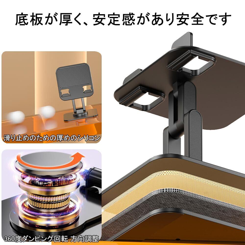 タブレットスタンド 卓上 安定性 3軸 ipad スタンド 高さ角度調整可能 360°回転 隠し 折りたたみ 厚さ約2.8cm タブレットとスマホ 兼用 スマホホルダー 軽量小型 滑り止め 放熱対策 持ち運びに便利 充電可能 人間工学設計 腰痛と猫背を改善 卓上 縦置き(ブラック)
