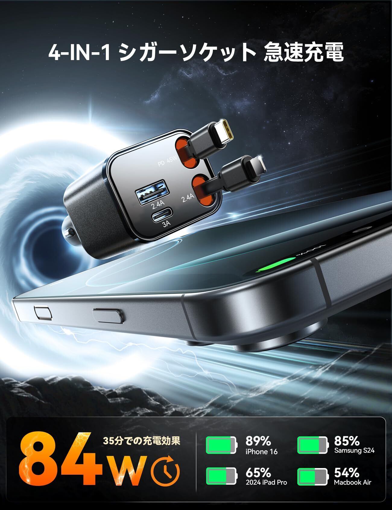 【最大84Wのパワフル出力|4台同時充電可能】 **4台同時充電対応!**Type-C(PD45W)+ iPhone(12W)巻き取り式ケーブルに加え、USB-C(QC15W)&USB-A(QC12W)の4ポート搭載します。MacBook Air、iPad、Galaxy S25 Ultra、iPhone 16など最新デバイスの急速充電が可能です。 家族旅行やビジネス出張、長距離ドライブに最適!車 スマホ 充電のニーズを1台で解決する高性能カーチャージャーです。