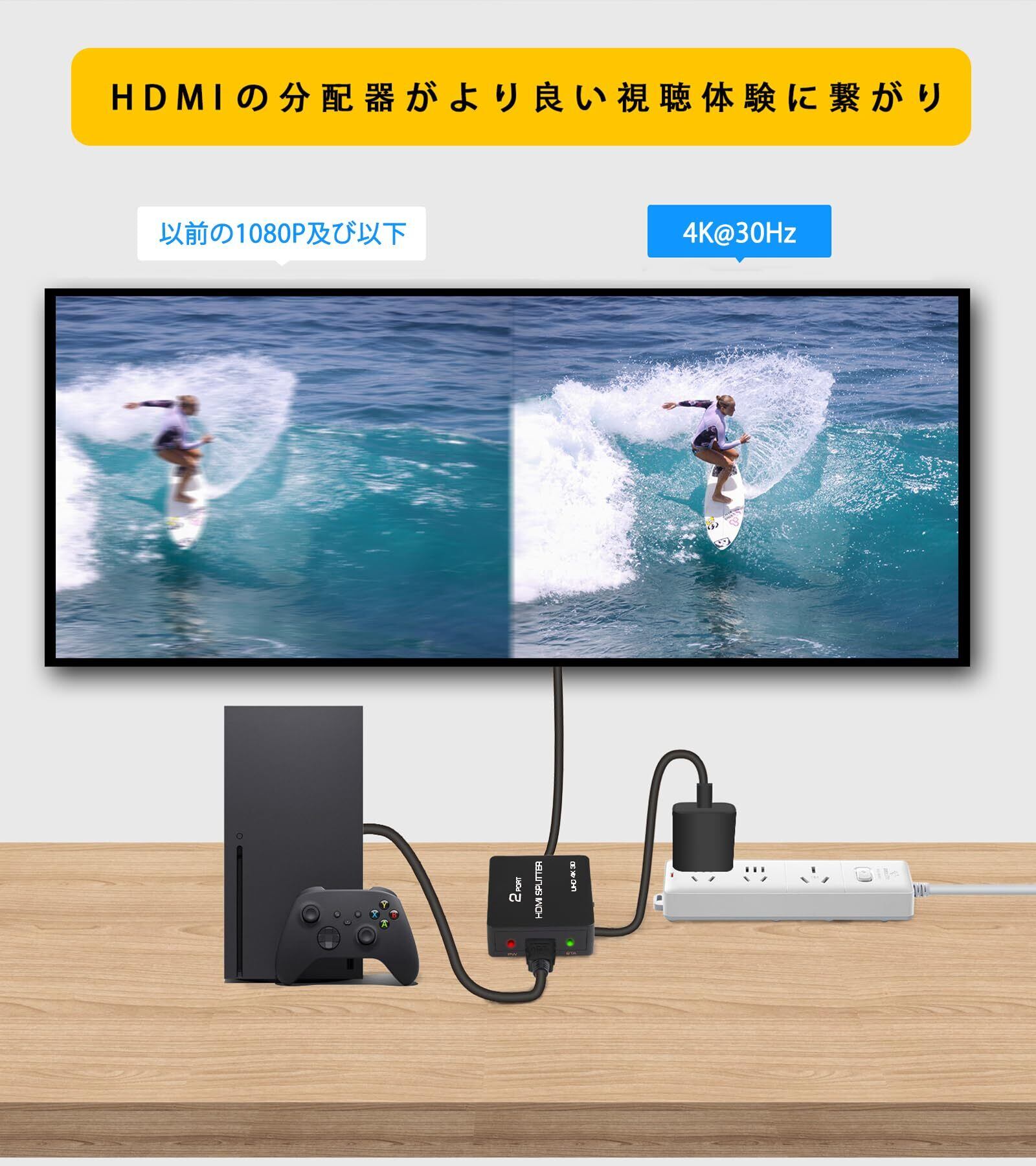 4K HDMI 分配器 スプリッター 2出力 1入力2出力 HDMI 分岐 2画面 同時出力 1080P 3D 対応 PC PS4 カメラ 任天堂スイッチ Blu-rayプレーヤー 対応 TV モニター プロジェクター 出力 USB給電ケーブル 日本語の取扱説明書付き