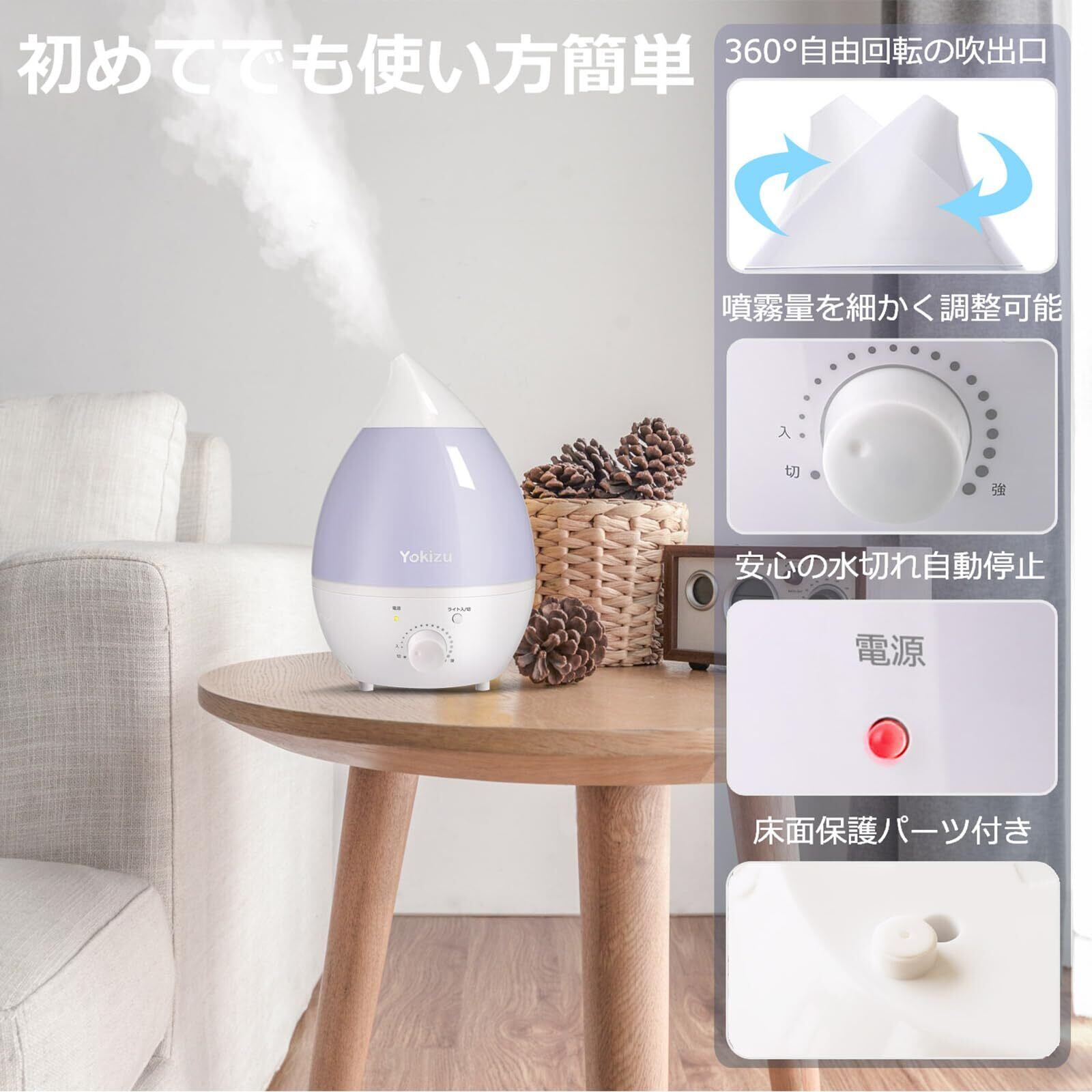 【無段階ミスト調節】ダイヤル操作で無段階に加湿量を調節可能。部屋の乾燥具合やお好きの湿度に合わせて簡单に微調節できます。自然蒸発しやすい5~10μm超微細ミストで、床や加湿器の周囲が濡れにくく、快適にお使い頂けます。操作がシンプルでわかりやすく、初心者やお年寄りにもオススメです。