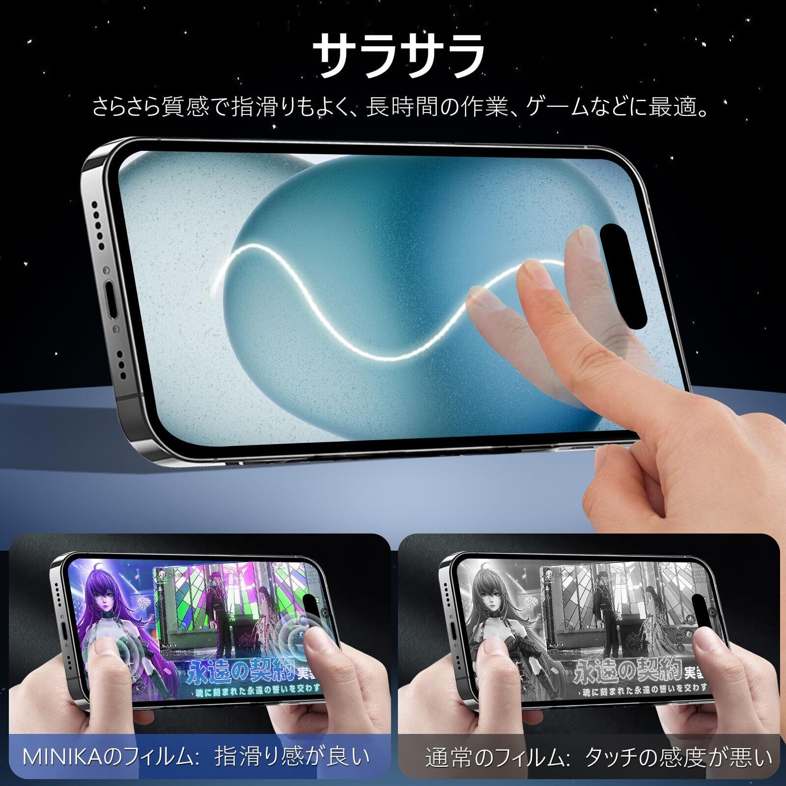 【アンチグレア・指紋防止・高感度タッチ】 アンチグレア(非光沢)タイプのさらさらで快適な操作感。光の反射を軽減し、より目に優しくちらつきを抑えます。同時に、iPhone15ガラスフィルムには撥油コーティングが施されており、指紋や汚れなどに強くなめらかな操作感を実現、付着した汚れなどは簡単に拭きとれます。こちらは高耐久撥油コーティングが施され、つるつるな滑り感を実現!ゲームをする人におすすめです。