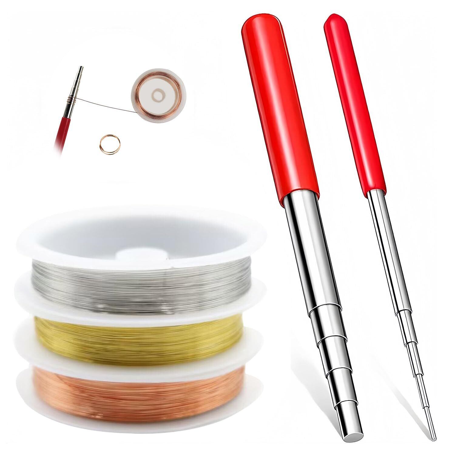 【製品仕様】2本の合金鋼製の巻線棒+金色、銀色と銅色の線径0.3mm(1巻の長さは約10m)のアクセサリーワイヤーセットです。2本のマンドレルは各5段階で、合わせて10個のサイズがあります。