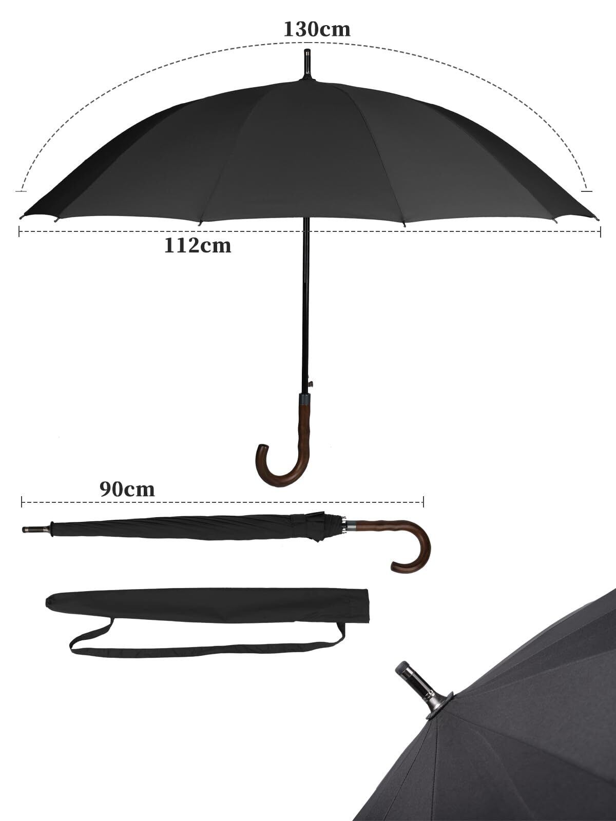 濡れない大判長傘:傘を開いた時、直径は約112cm、弧長は約130cmの超大きい雨傘で、体をすっぽり覆って大雨から守ってくれます。大柄な男性が差しても窮屈に感じない余裕のある大きさ、2人で入ったり、リュックを背負っていてもほとんど濡れません。収納カバー付きで持ち運び便利です。