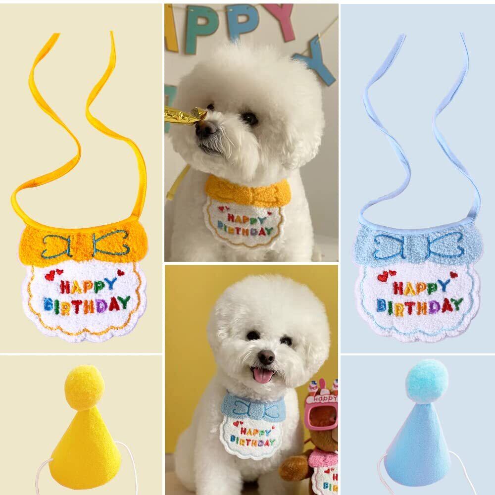 LIKENNY ペット 誕生日帽子 唾液タオル 2個セット 可愛い 飾り付け バースデー 猫 犬用 飾り 記念日 誕生日 バースデーハット お散歩 おしゃれ 柔らかく 調節可能 犬猫のためのペットの誕生日用品 プレゼント (イエロー)