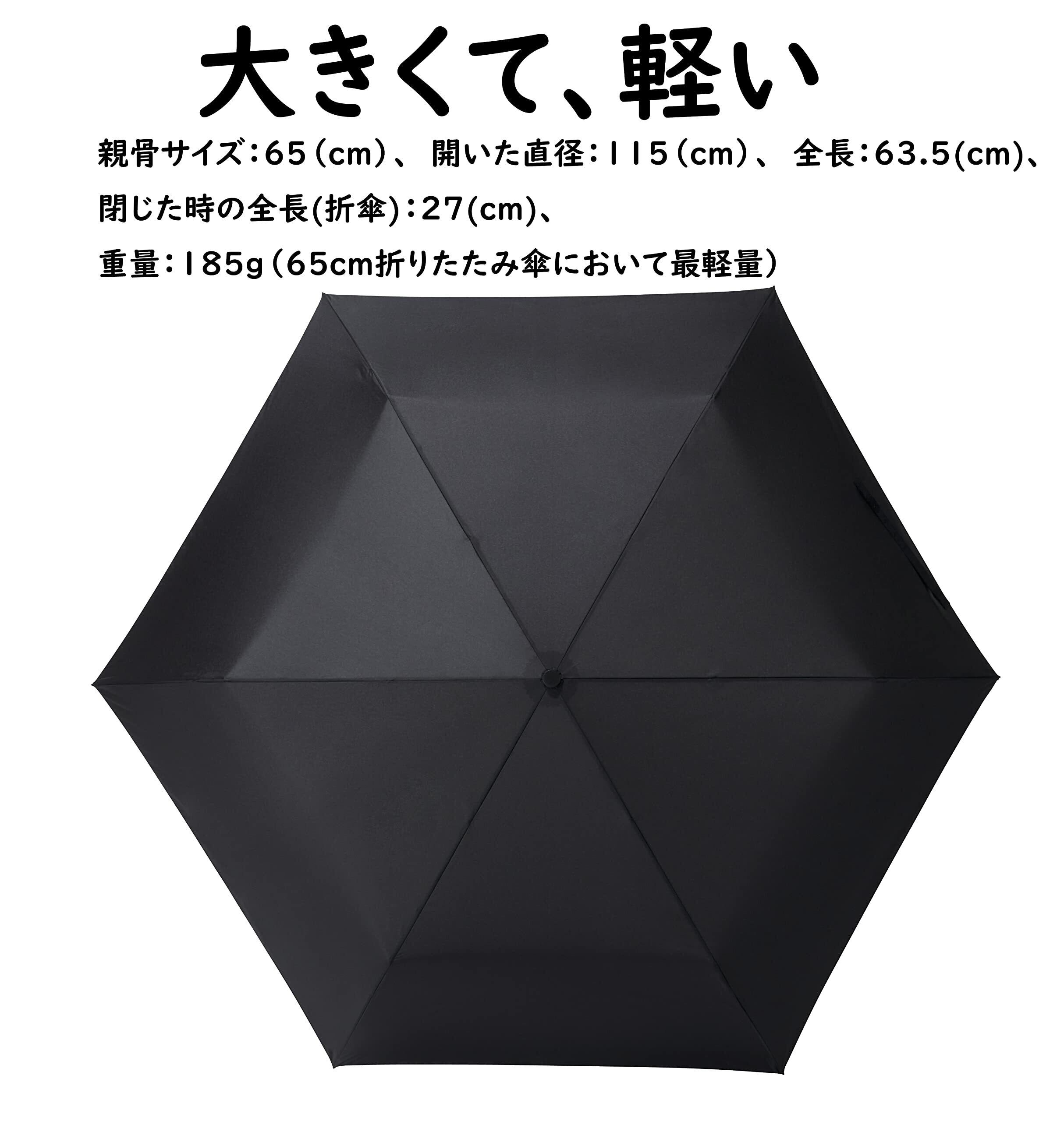 親骨サイズ:65(cm)、 開いた直径:115(cm)、 全長:63.5(cm)、 閉じた時の全長(折傘):27(cm)、 重量:185g(65cm折りたたみ傘において最軽量)