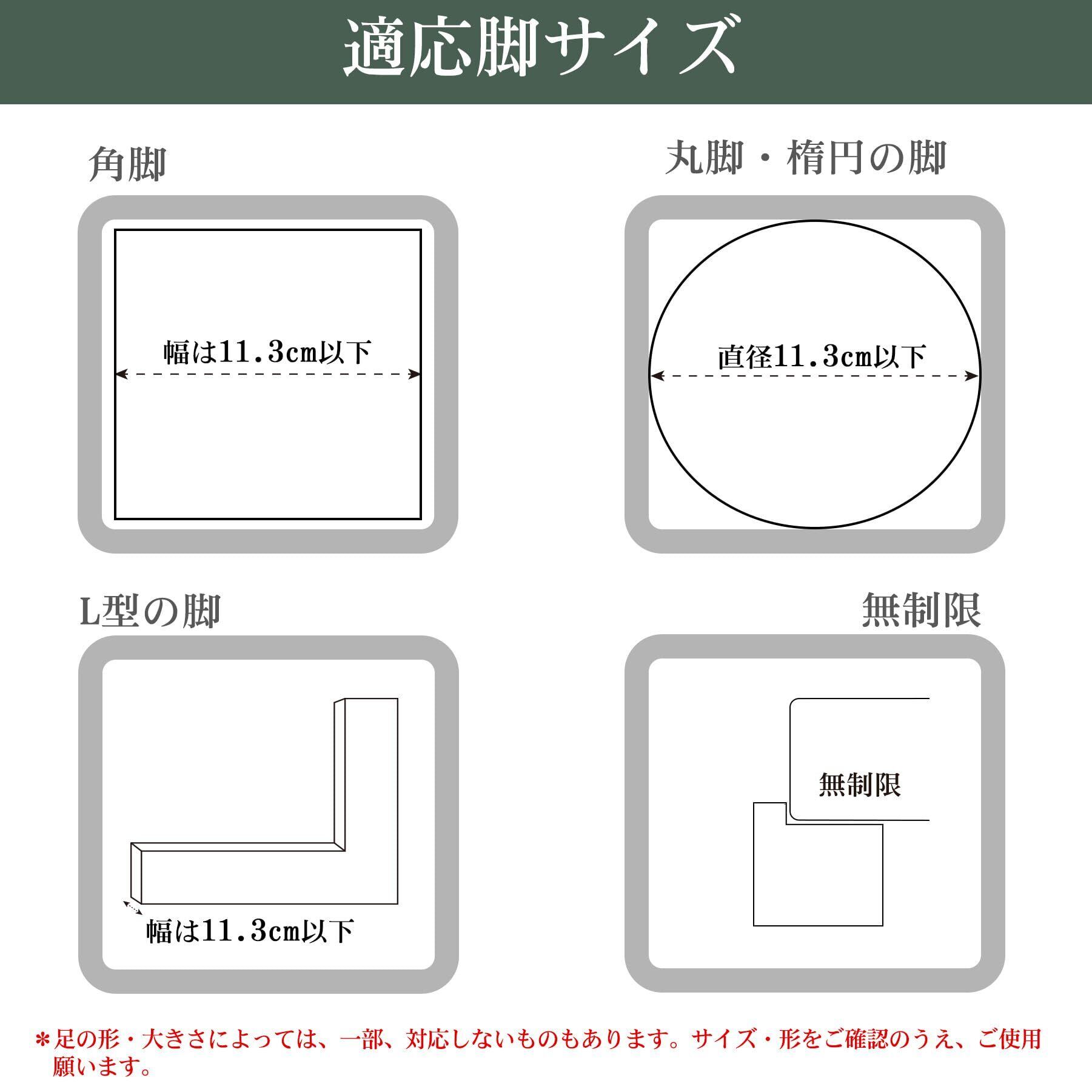 【注意事項】家具の脚が本品に納まる範囲かどうか、事前にご確認の上、お買い求めください。必ず4個セットでご使用ください。万一、1個でも破損した場合は直ちに使用を中止してください。