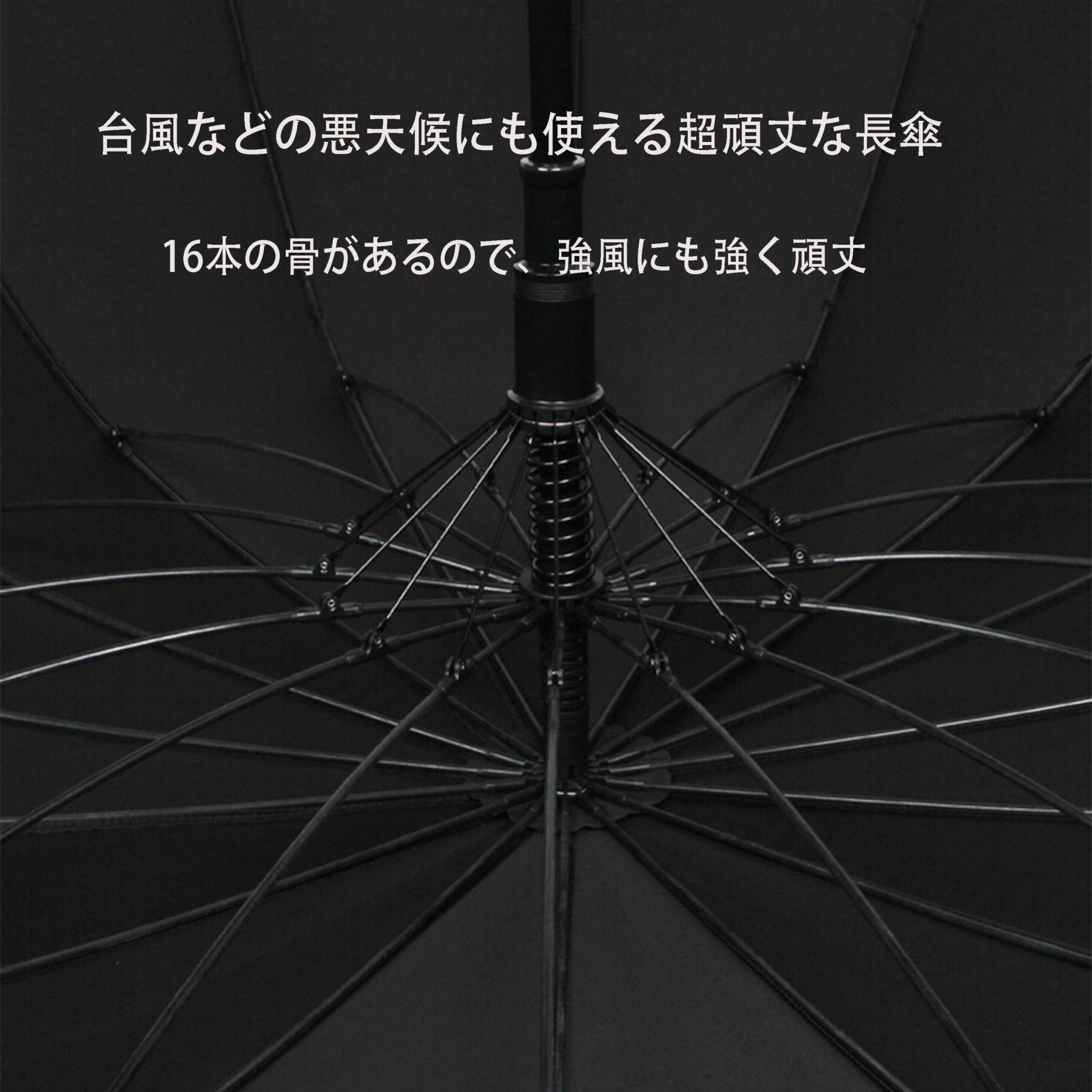 【高強度な16本骨構造メンズ長傘】親骨はしなやかで頑丈なグラスファイバーを採用し、16本骨で円に近いフォルムになっていて、風に強い安定感があります。