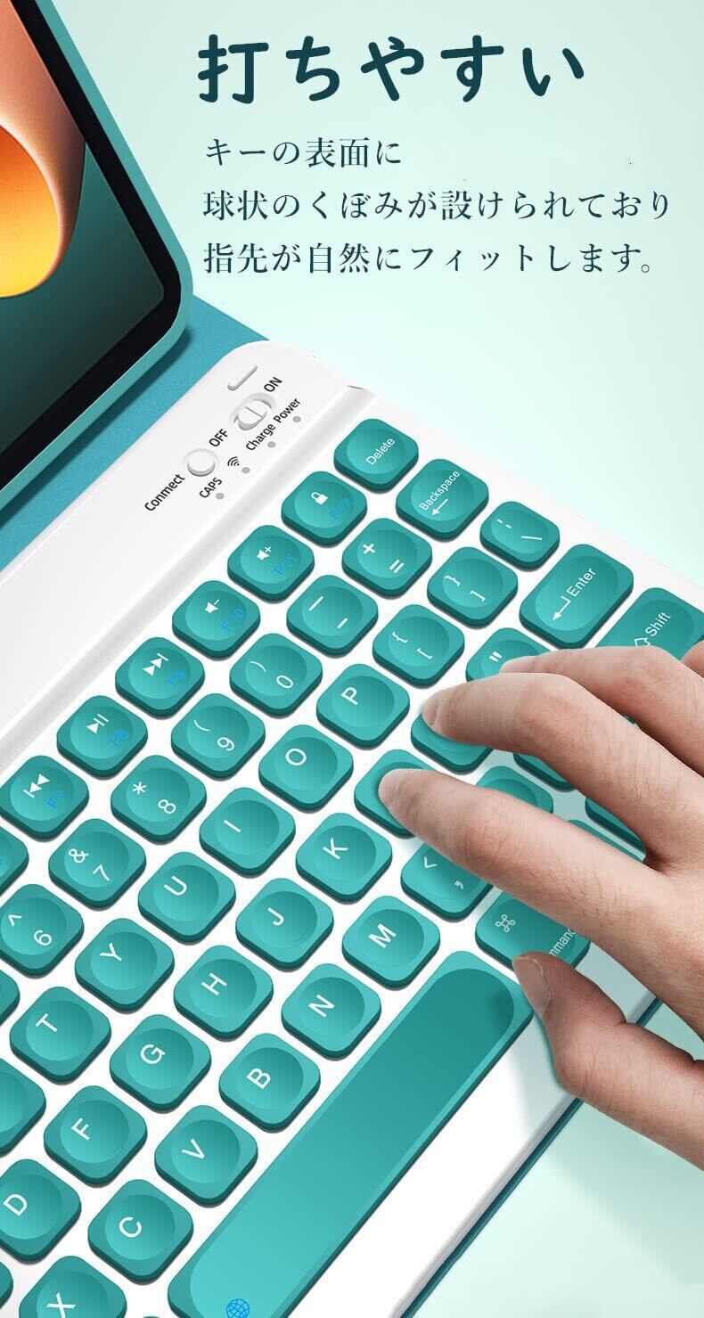 ワイヤレスキーボード:2022年最新人気 iPad キーボード ケース 、各キーの表面に球状のくぼみが設けられており、指先が自然にフィットします、正確に入力しやすい、鮮やかなカラーキートップがおしゃれかわいい、ほかにない可愛さで目を引きます。おすすめの iPadキーボード付きケース。