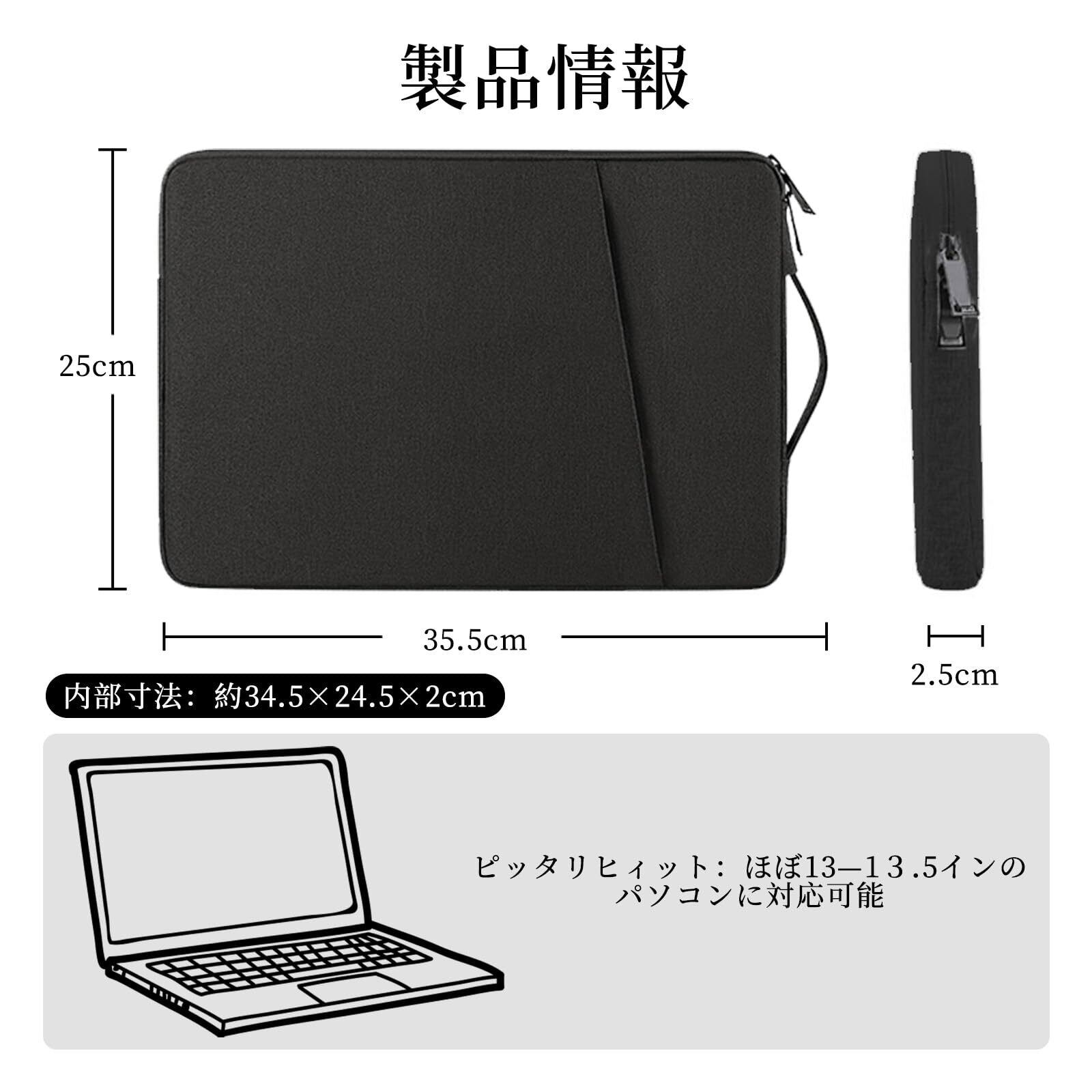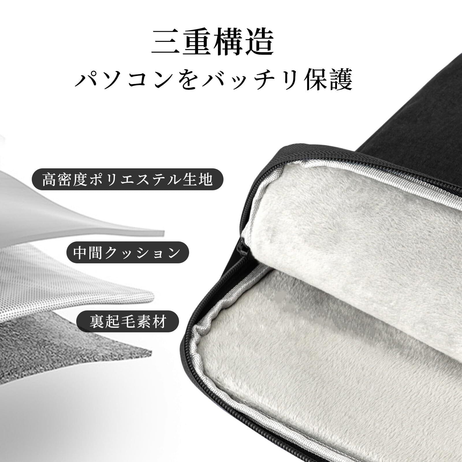 【素材】パソコンケースの外寸:約35.5×25×2.5cm。内寸:約34.5×24.5×2cm。「表面」は高撥水素材ポリエステルで、雨や雪による水の侵入を抑え、本体の水濡れを防ぎます。「内部」はふわふわ素材の衝撃吸収クッション層で、裏起毛で手触り良く、しっかりパソコンを保護します。