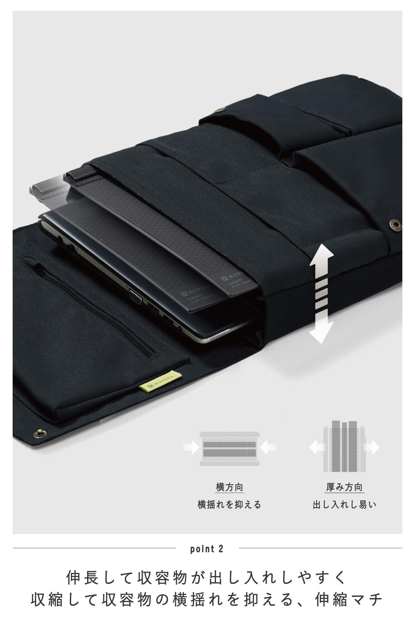 POINT3:PCから書類までこれ一つで収容。かさばりにくくスッキリ収まる、ポケット配置。