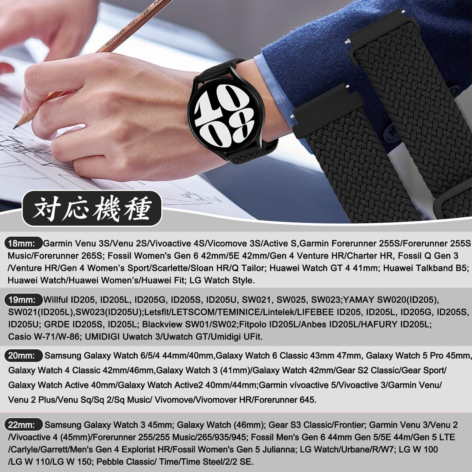 【互換性のあるモデル】20mmナイロンベルトばすべての従来の時計と20mm幅の時計ラグを備えたスマートウォッチに適合します。例えばmsung Galaxy Watch 7/6/5/4 44mm 40mm, Galaxy Watch FE 40mm, Galaxy Watch 6 Classic 43mm 47mm, Galaxy Watch 5 Pro 45mm, Galaxy Watch 4 Classic 42mm/46mm, Galaxy Watch 3 (41mm)/Galaxy Watch 42mm/Gear S2 Classic/Galaxy Watch Active 40mm/Galaxy Watch Active2 40mm/44mm; Garmin Vívoactive 5/Vivoactive 3/Venu/Venu 2 Plus/Venu Sq/Sq 2/Sq Music;Amazfit Active 2;Amazfit Active等.