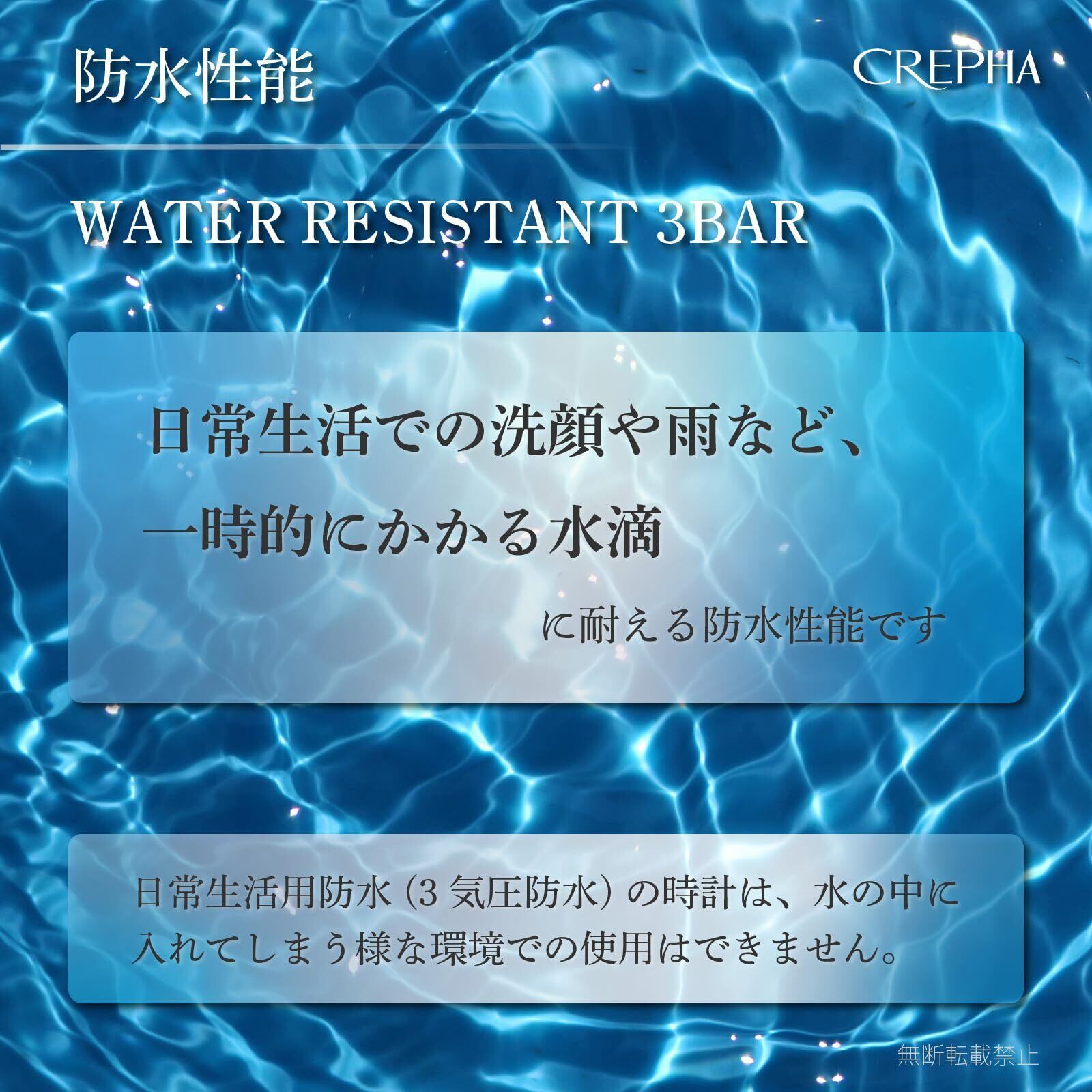 日常生活防水は、汗や雨などに耐えられる程度の耐水性です。そのため、水仕事や水泳・入浴は故障の原因となるためお控え下さい。