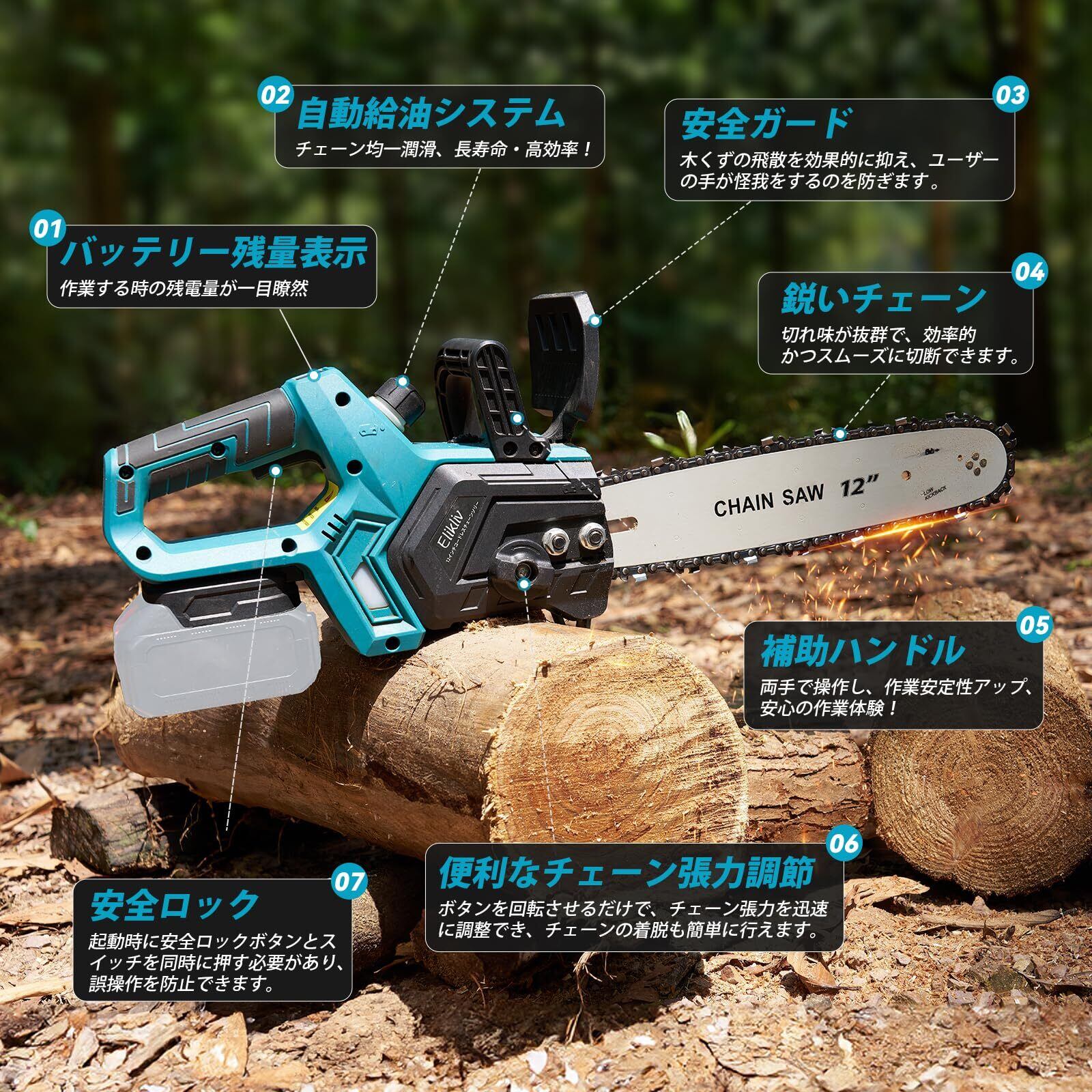 【12 インチ高切断力の充電式チェーンソー】弊社製品は革新的なブラシレスモーターを採用し、わずか 10 秒で直径 350mm の丸太を切断でき、時間とエネルギーを大幅に節約できます。そのブラシレスモーターにはたくさんの魅力があります。① 安全性抜群:火花や煙が出ないので、安全に使えます。②長寿命:ブラシ交換不要で、耐久性が高く、安定した性能を維持します。③ 省エネ高出力:エネルギー消費が少なく、1 つのバッテリーでも長時間使えます。④作業性能安定:振動が少なく、作業効率と精度が高まります 。本体重量はわずか 2kg!家庭の DIY プロジェクトから樹木の伐採まで、あらゆる作業に対応できる万能ツールです。さらに専用の収納ケース付きで、軽量設計のため持ち運びも大変簡単です。️ドライブリンク数:45 コマ。替刃を購入する場合は、この商品(ASIN:B09STZXHFF)をご注文ください。