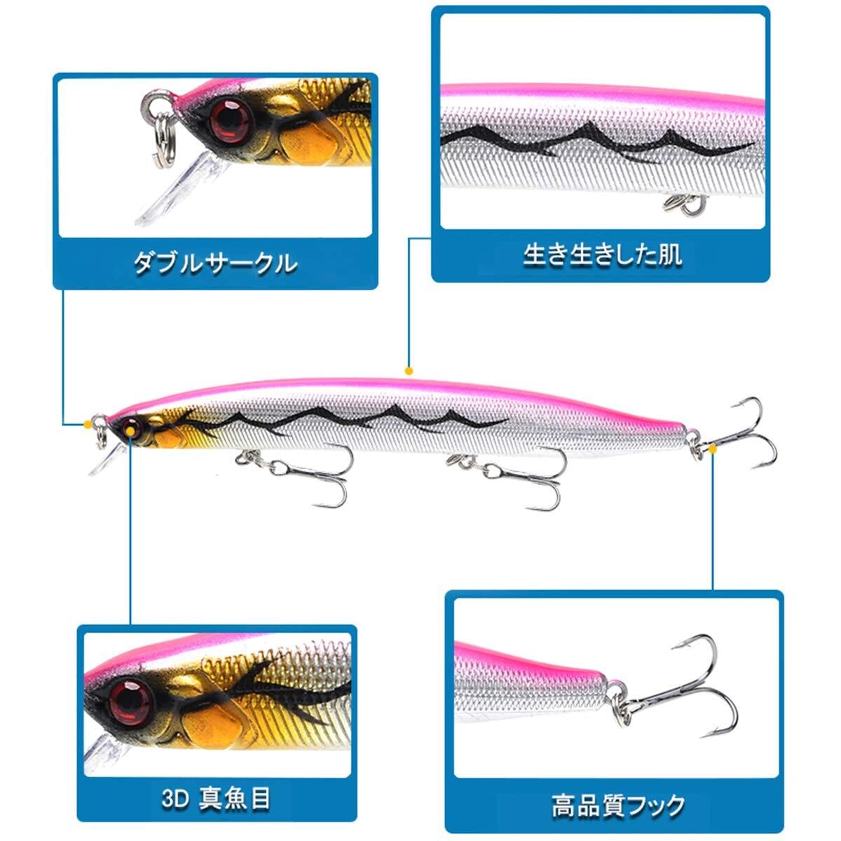 美しい仕上げ: 輝くミラーコーティングが施され、反射率が向上。水中で本物の魚のような効果で攻撃的な反応を引き出す。3Dデザインの魚の目が魚を誘惑。