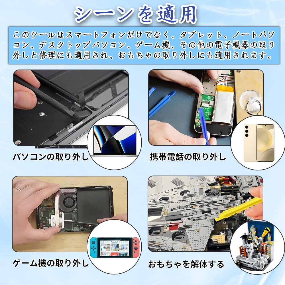 5.多機能性と広範な適用性:私たちのセットはスマートフォンの修理だけでなく、タブレット、ノートパソコン、ゲーム機など多くの電子製品の修理にも適しています。iPhoneからAndroid、SONY、HUAWEI、LG、サムスン、Panasonic、Kindle、iPad、任天堂のゲーム機まで、幅広い電子製品に対応しています。このツールは修理作業の強力なアシスタントになります。